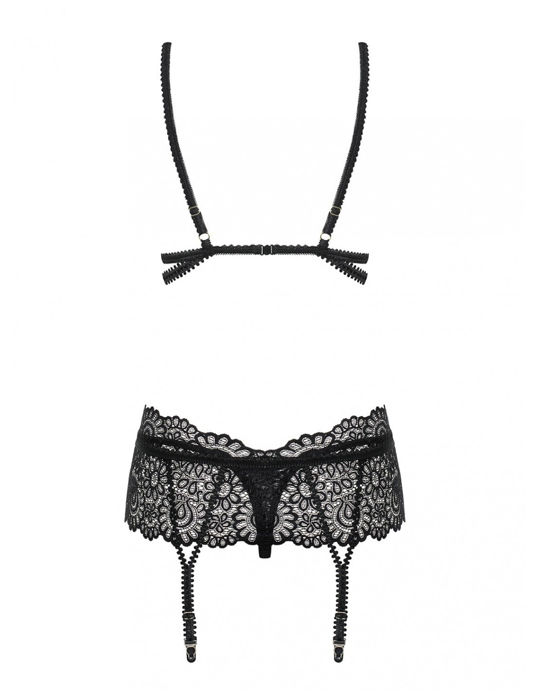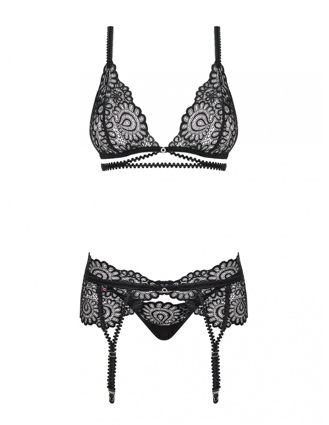 Komplet Mixty to połączenie eleganckiej koronki i efektownych paseczków, które sprawiają, że nie sposób mu się oprzeć. Miękki, koronkowy biustonosz pięknie zaznacza Twoje piersi, a regulowane ramiączka zapewniają idealne dopasowanie. Zapięcie na plecach gwarantuje wygodę i łatwość noszenia. Dodatkowo, komplet zawiera pas z kuszącymi paskami do pończoch oraz zmysłowe stringi. Ozdobne, błyszczące kółeczka dodają mu jeszcze bardziej uwodzicielskiego charakteru.