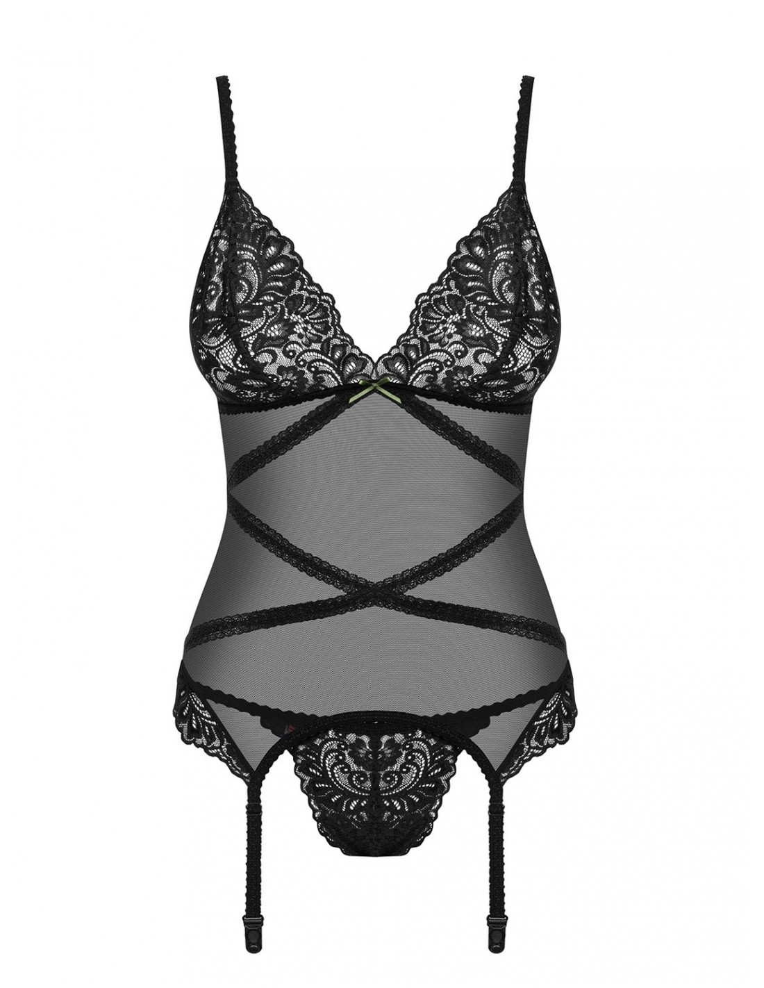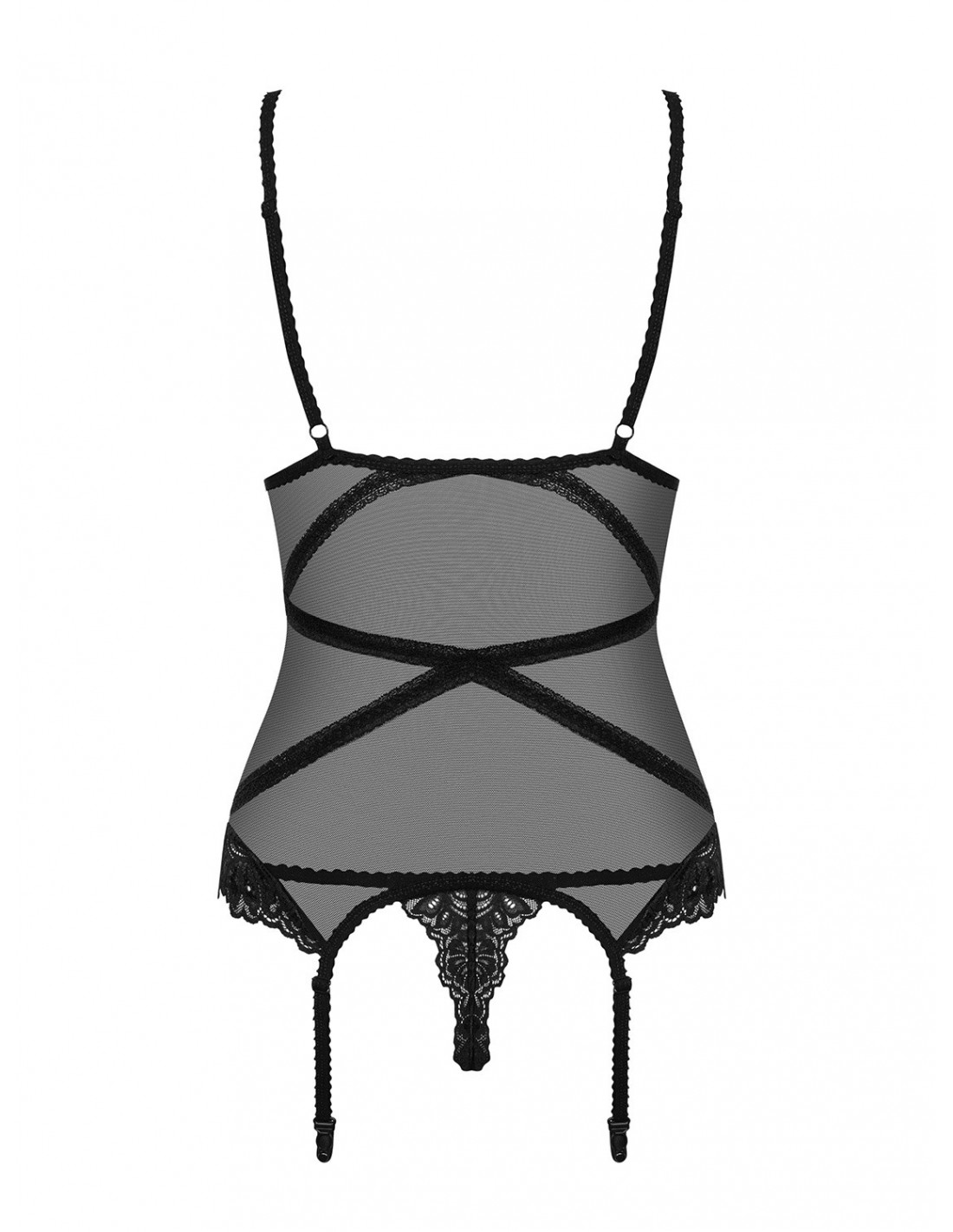 Wyjątkowe cechy tego gorsetu i stringów sprawią, że będziesz czuć się wyjątkowo i zmysłowo. Drapieżna siateczka z paseczkami na brzuchu i plecach dodaje całości pazura i sprawia, że wyglądasz jeszcze bardziej uwodzicielsko. Krój odsłaniający stringi to kuszący detal, który dodaje kompletowi jeszcze więcej seksapilu. Regulowane ramiączka pozwalają dostosować długość do swoich preferencji, a delikatna koronka na biuście i biodrach pięknie podkreśla Twoje atuty.