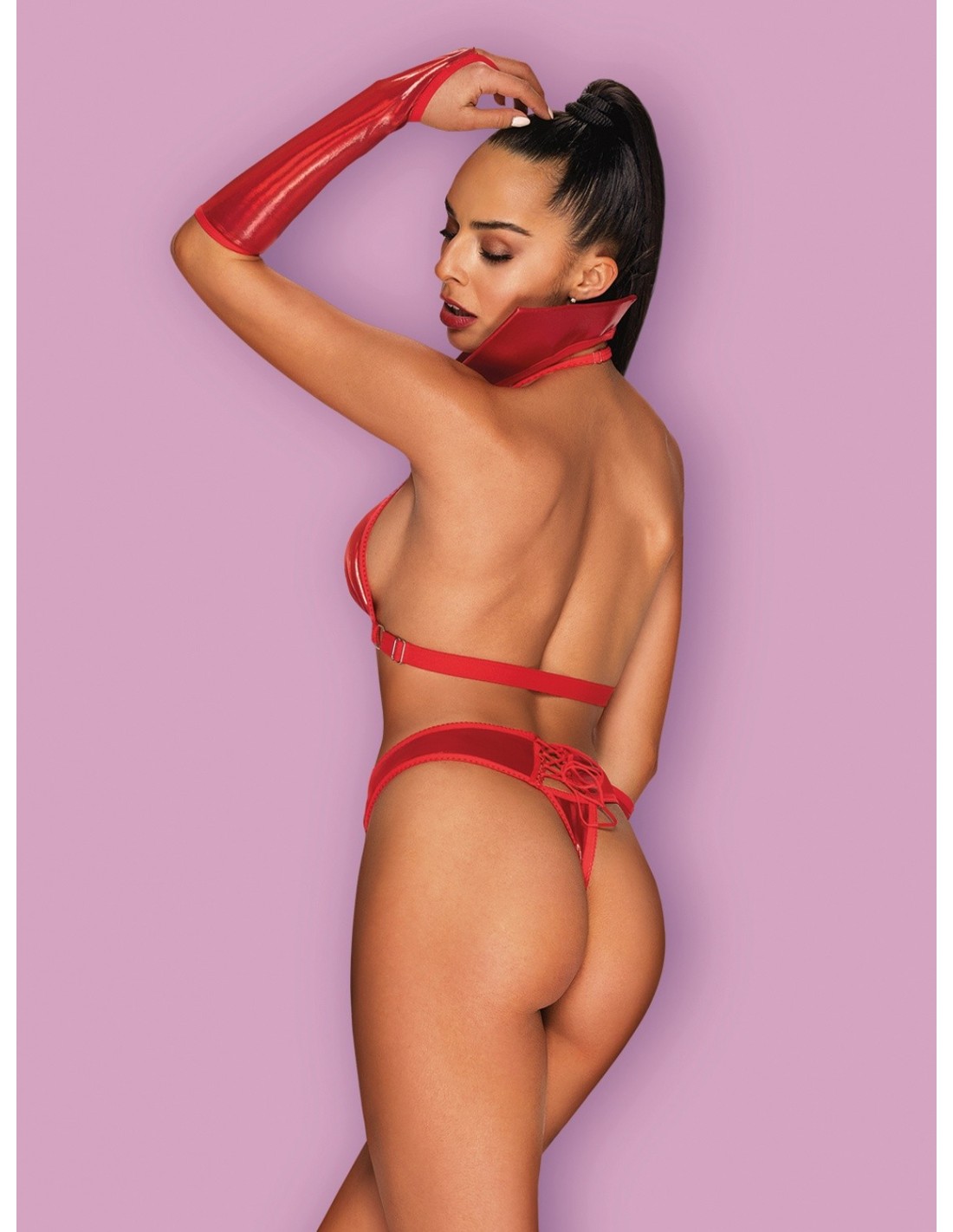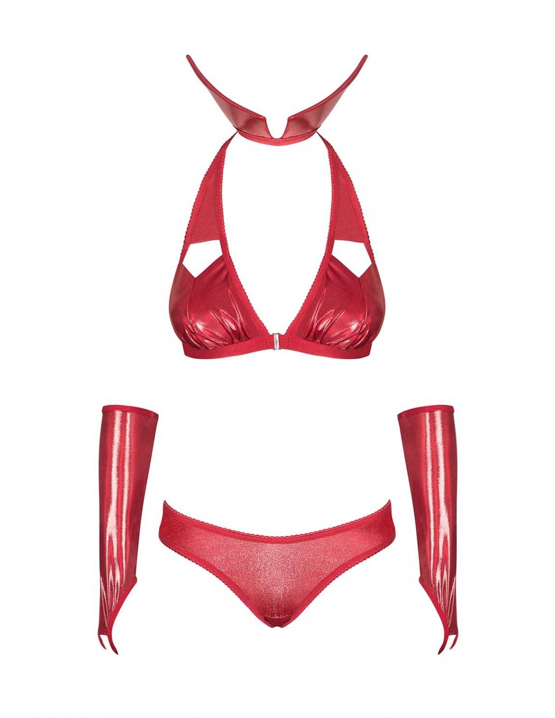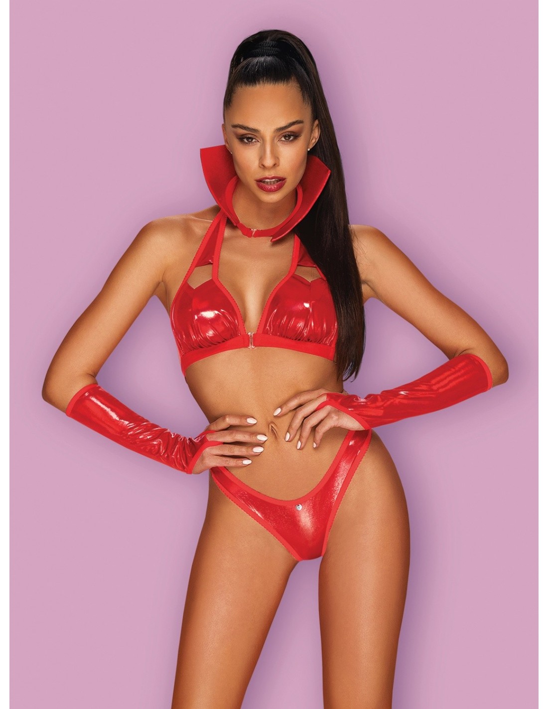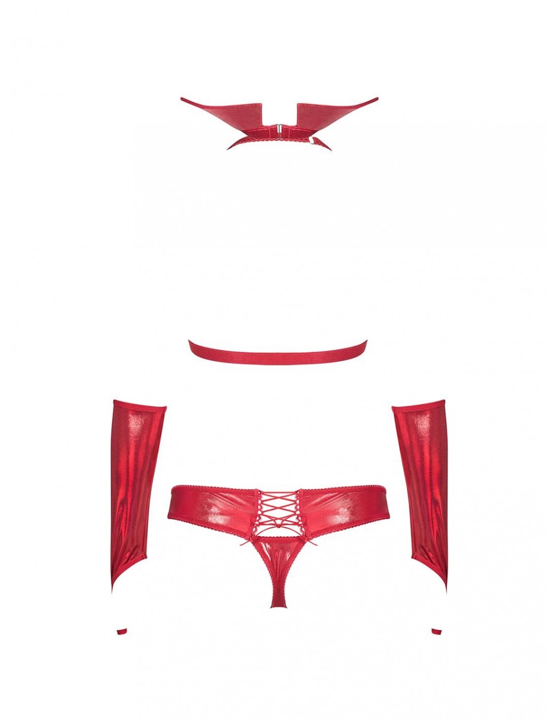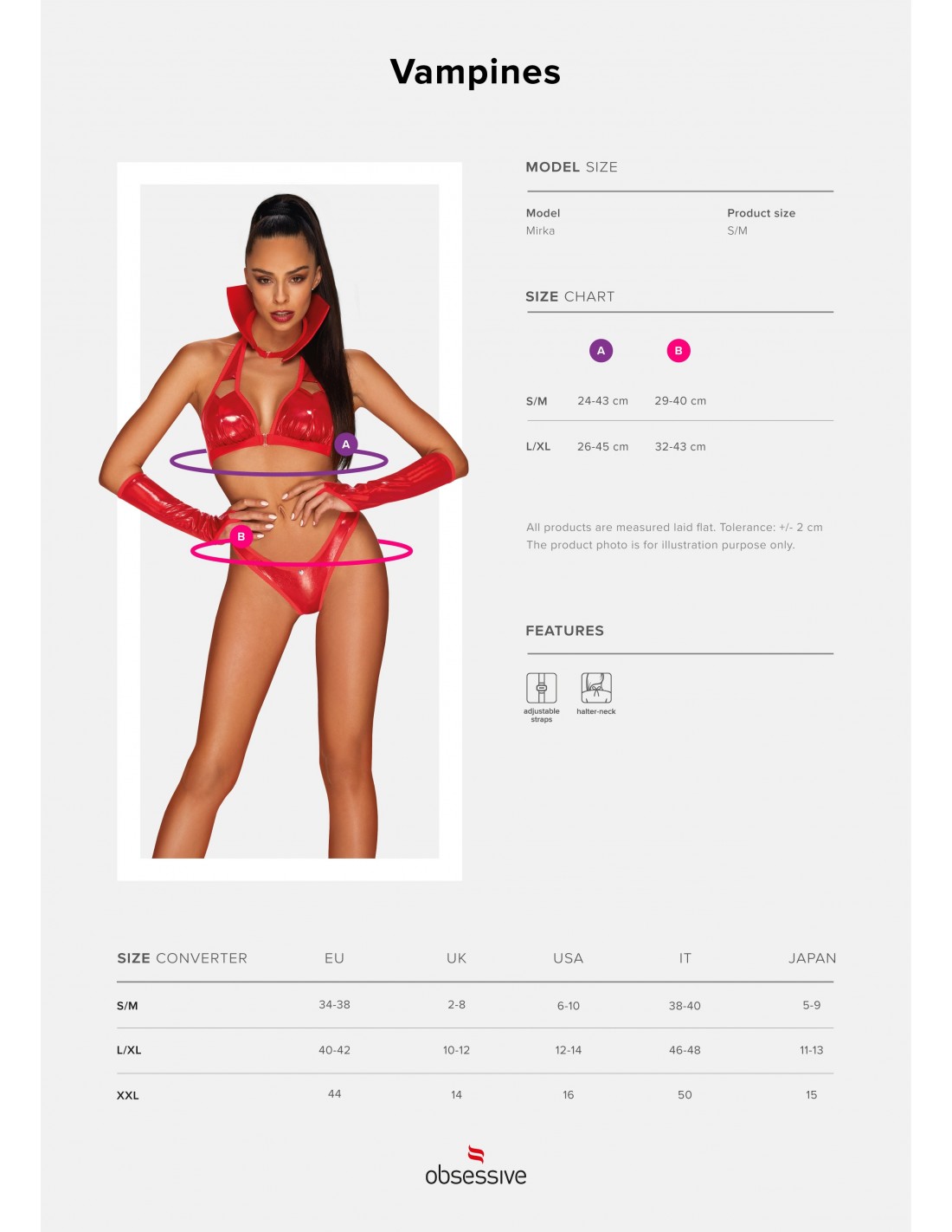 Wampires L/XL to uwodzicielski komplet, składający się z kołnierzyka, biustonosza, stringów i mitenek. Każdy z tych elementów został starannie zaprojektowany, aby podkreślić Twoje kobiece kształty i wywołać zachwyt Twojego partnera. Odstający kołnierzyk dodaje seksownego charakteru, a subtelny biustonosz z ramiączkiem zakładanym na szyję kusząco podkreśla Twój dekolt. Seksowne wycięcia nad biustem i regulowany pasek biegnący przez plecy dodają kobiecego wyglądu i zapewniają wygodę. Dodatkowo, ozdobne wiązanie z tyłu stringów oraz intrygujące mitenki sięgające łokci sprawiają, że ten kostium zachwyci każdego.