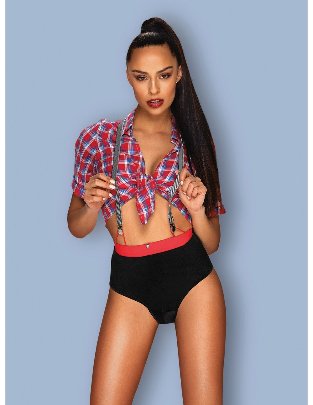 Wyobraź sobie siebie w tej kraciastej koszulce, która podkreśla Twoje kobiece kształty i daje Ci niezwykły urok. Elastyczne szelki dodają Ci jeszcze więcej seksapilu, a odpinane z przodu stanowią subtelny dodatek, który sprawia, że cały strój jest jeszcze bardziej uwodzicielski.