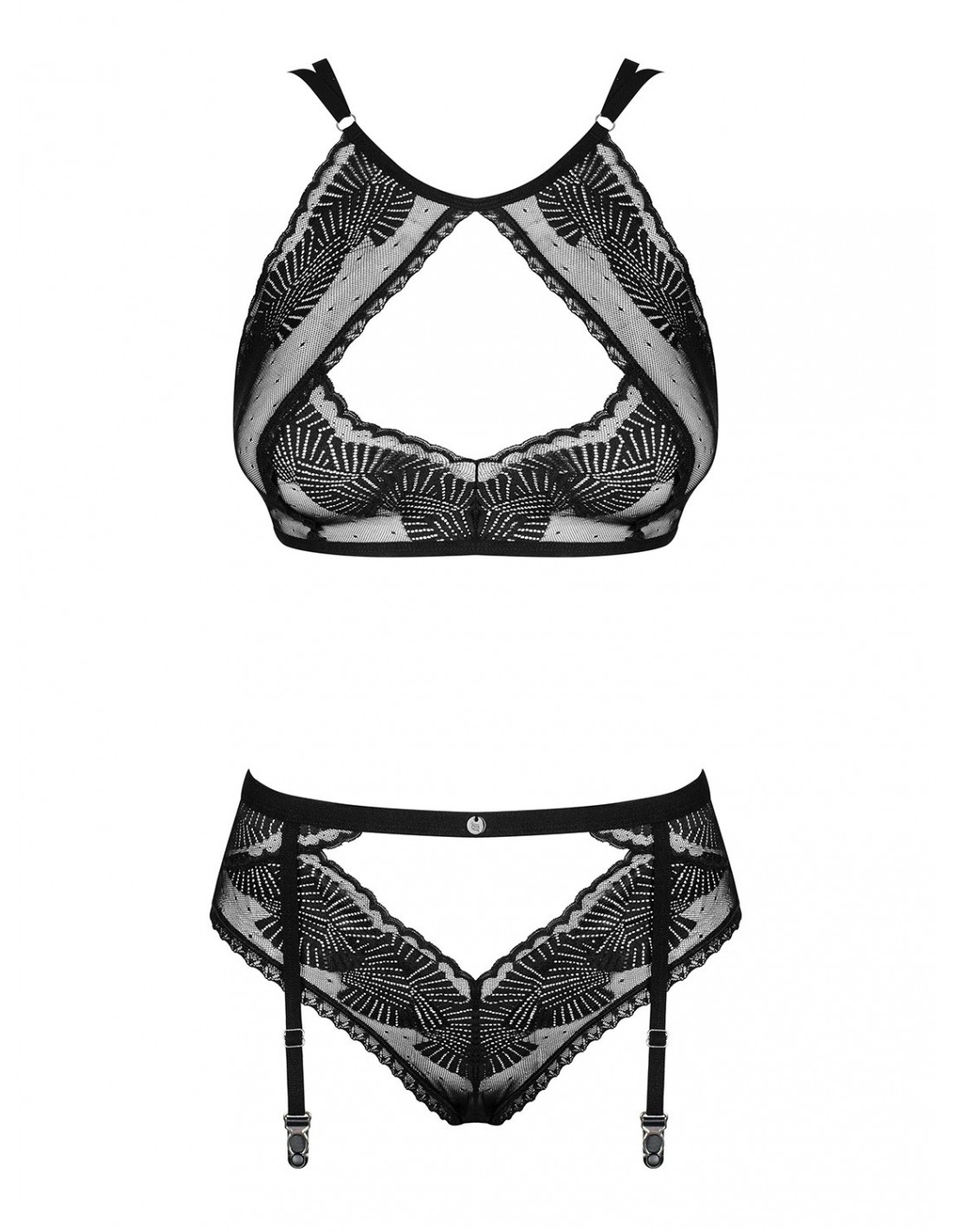 Dekolt ozdobiony geometrycznym wycięciem dodaje jeszcze więcej seksapilu, a figi zdobione wycięciami i połyskującą zawieszką przyciągają wzrok. Regulowane paski do pończoch połączone na stałe z majteczkami dodają pikanterii, a lekka, prześwitująca siateczka o oryginalnym wzorze sprawia, że czujesz się niezwykle kobieco i uwodzicielsko.