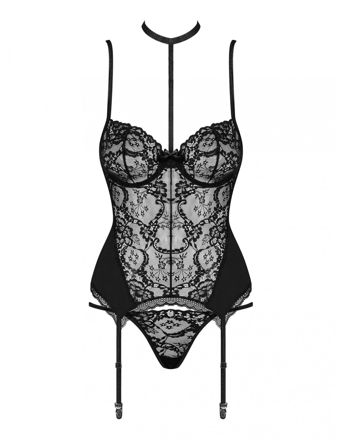 W zestawie znajdziesz lekką koszulkę i zmysłowe stringi, które podkreślą Twoje kobiece kształty. Dekolt koszulki jest ozdobiony odpinanym chokerem i satynową kokardką z błyszczącą zawieszką, dodającym całości jeszcze więcej uroku. Regulowane ramiączka zapewniają idealne dopasowanie, a kilkustopniowe zapięcie sprawia, że koszulka będzie pasować do Twojej sylwetki jak ulał.