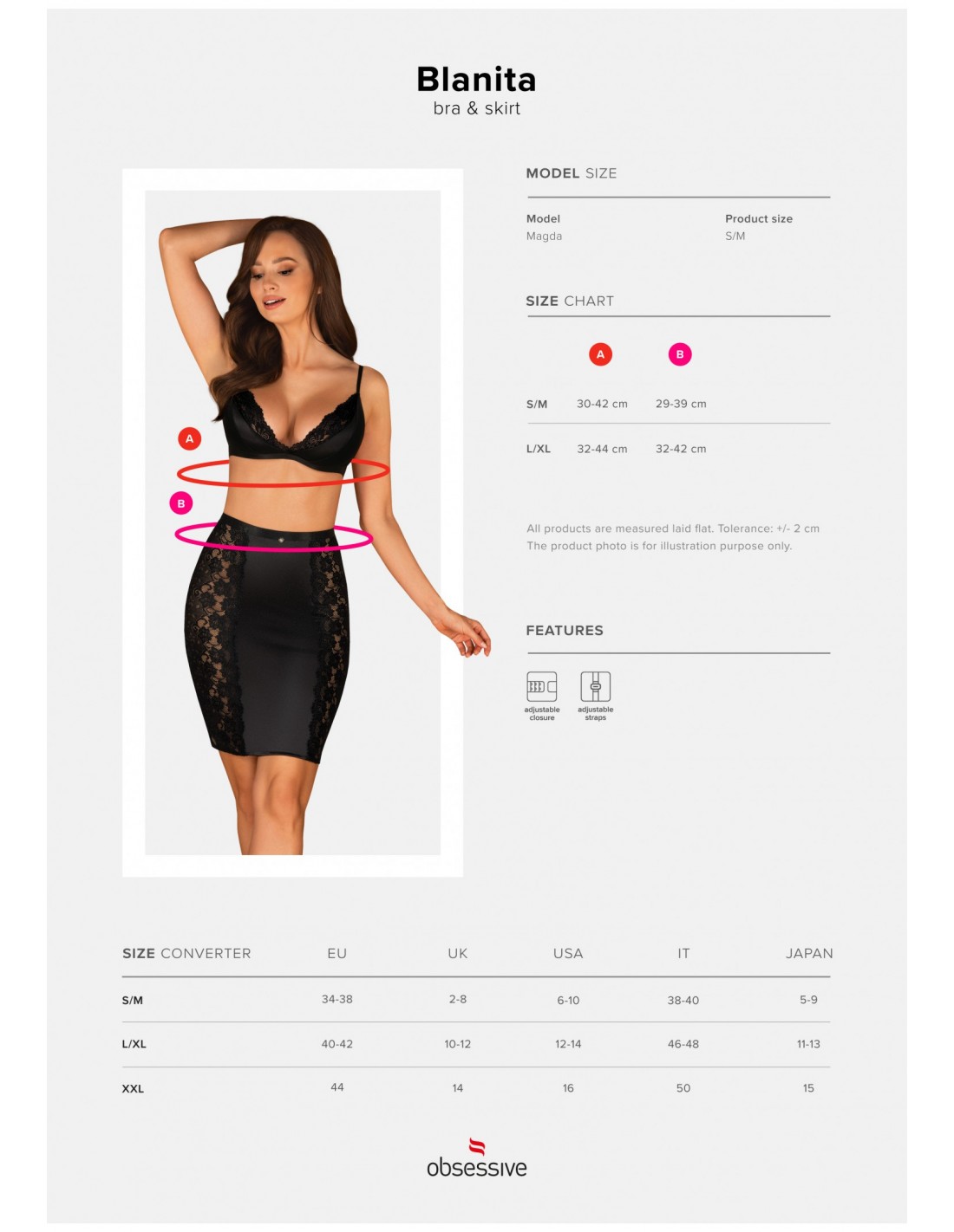 Zapraszamy do świata niezapomnianych doznań, gdzie czarny kolor i klasyczna elegancja spotykają się w komplecie Blanita. Ten niezwykły komplet bielizny erotycznej marki Obsessive sprawi, że poczujesz się wyjątkowo i uwodzicielsko.