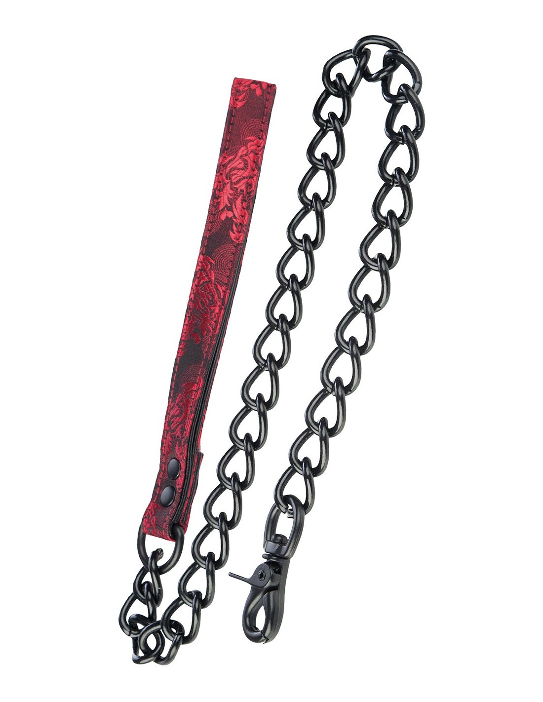 Wykonana z bogato zdobionej, czarno-czerwonej tkaniny o subtelnym połysku, smycz i obroża BDSM Scandal Leash nie tylko zapewniają wygodę, ale także estetyczny wygląd. Regulowana obroża z metalowym rozłączanym kółkiem to nie tylko piękny dodatek, ale także narzędzie do ograniczania swobody poruszania się Twojego partnera, co pozwala na budowanie więzi opartej na zaufaniu i intymności.