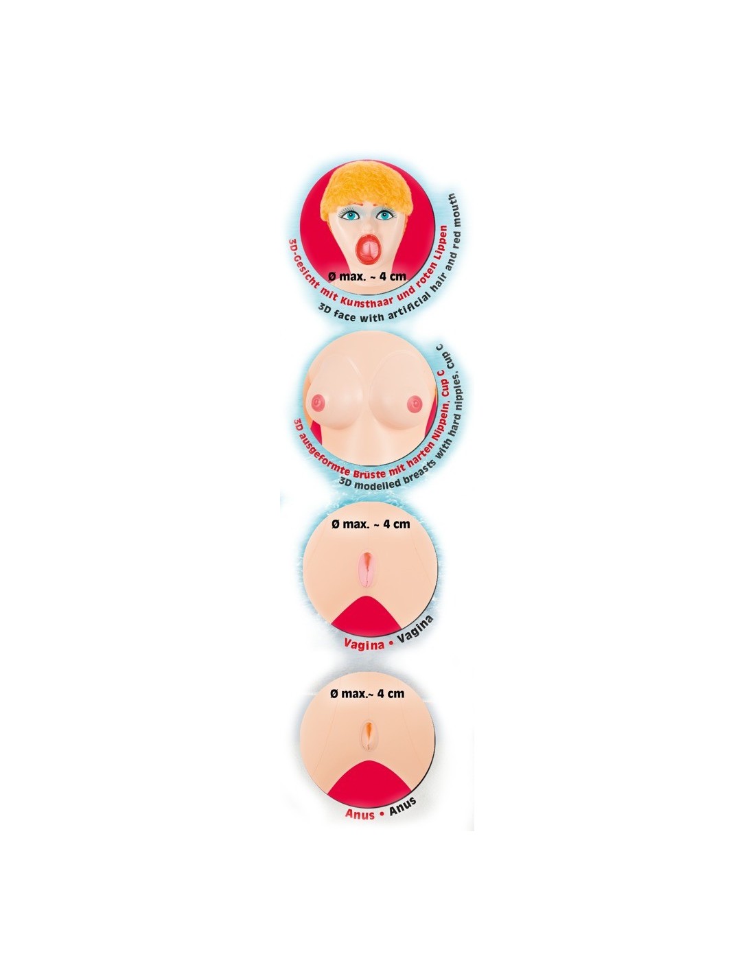 Ta wymarzona dziewczyna wykonana z PVC jest naprawdę namiętną kochanką. Piękna twarz z bezczelną grzywką sprawia, że wygląda naprawdę przyjaźnie, a 3 kanały przyjemności zapraszają jej partnera do odkrywania ich w intymny sposób. Piersi ozdobione są pięknymi sutkami. Kradnie również show na wieczorach kawalerskich.