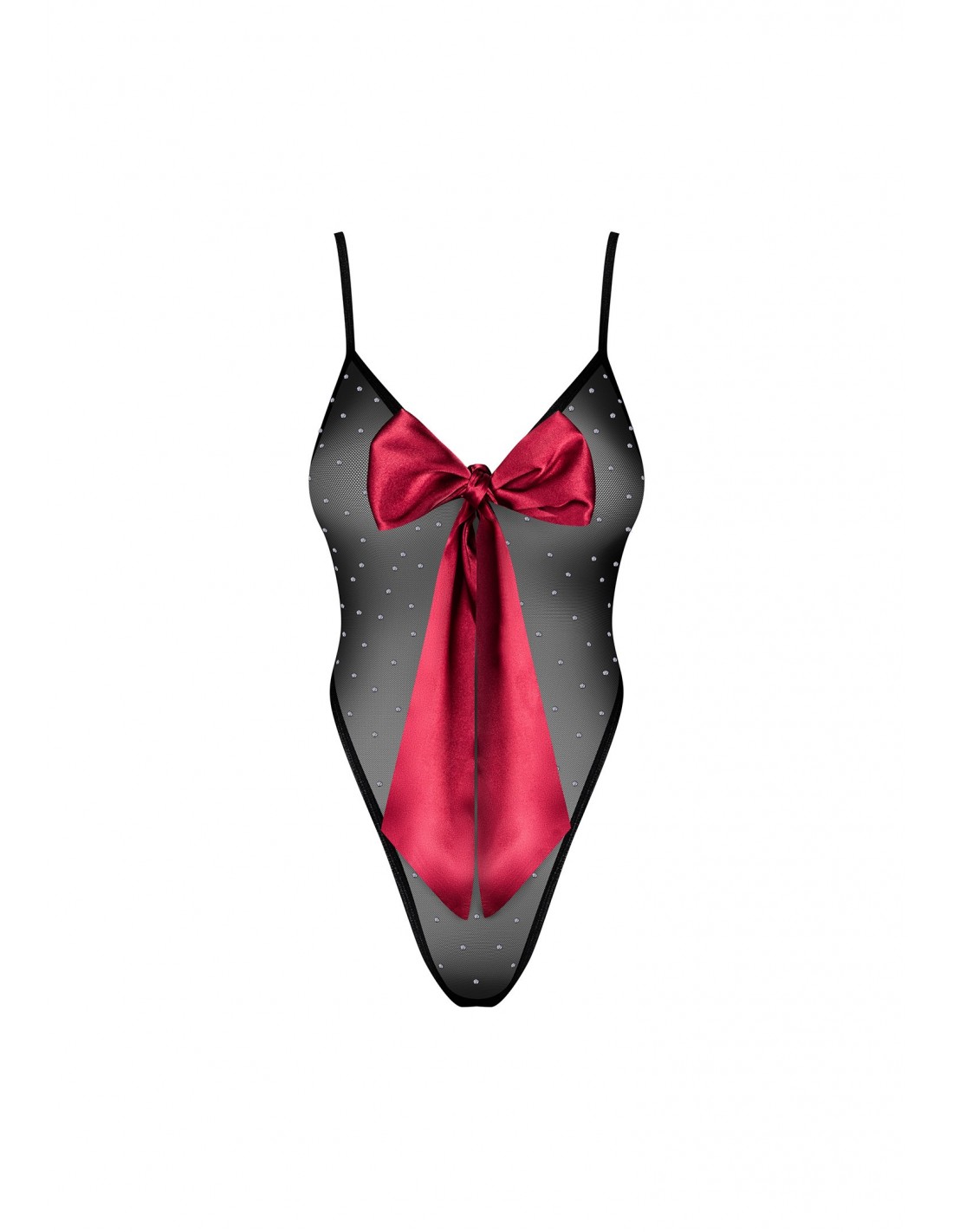 Body Tienesy to nie tylko zwykłe body erotyczne - to prawdziwe dzieło sztuki, które uwodzi i intryguje. Czerwona kokarda oraz brokatowe kropeczki pięknie zdobią Twoje ciało, przyciągając wzrok i pociągając zmysły. Regulowane ramiączka gwarantują perfekcyjne dopasowanie, a kilkustopniowe zapięcie na plecach zapewnia wygodę i łatwość użytkowania.