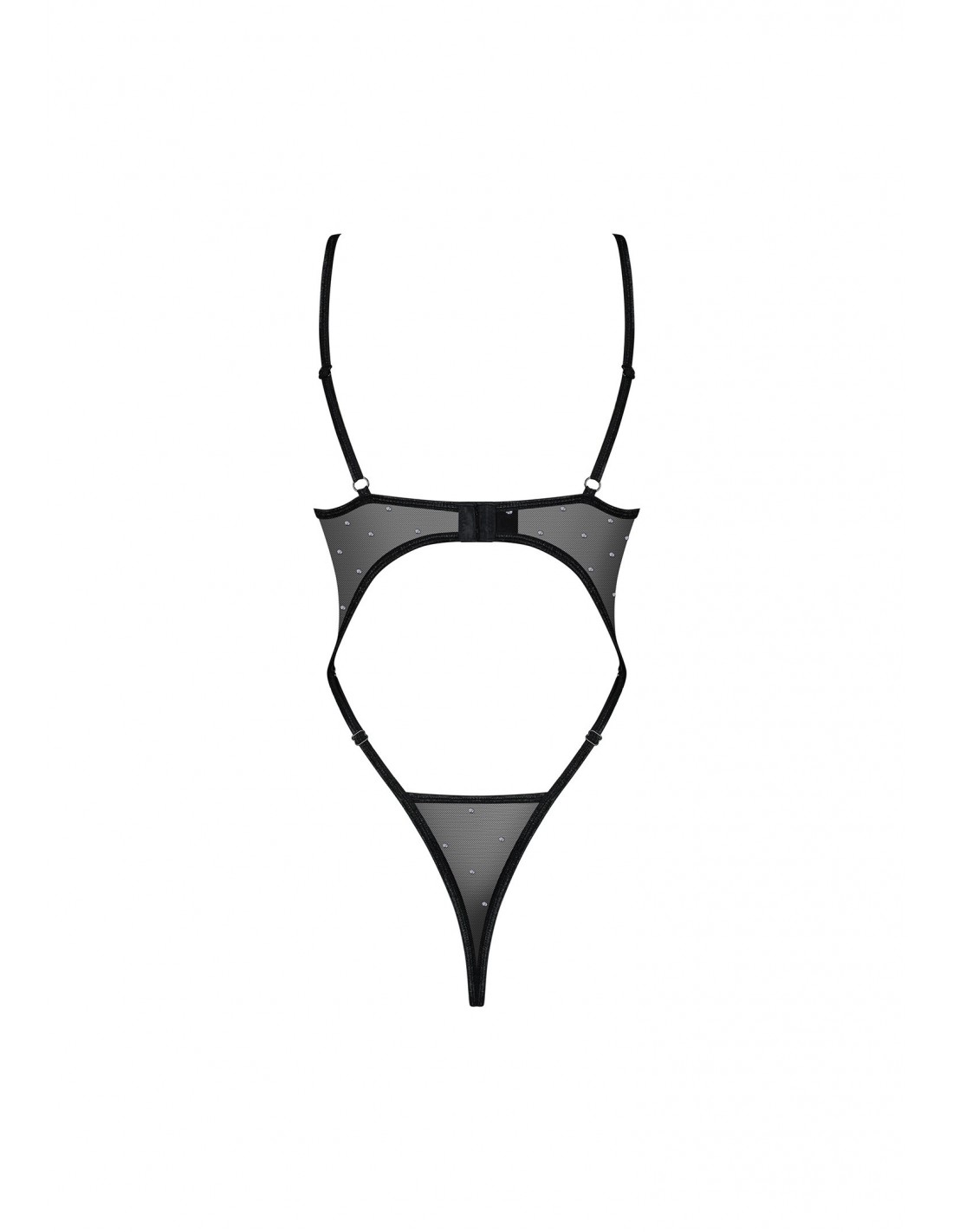 Ponadto, elastyczne paseczki w połączeniu z prześwitującą, czarną tkaniną tworzą gorące trio, które odsłania piekielnie seksownie Twoje pośladki i plecy. Materiał, z którego wykonane jest body (90% poliamid, 10% elastan), jest niezwykle miękki i elastyczny, zapewniając Ci komfort noszenia przez całą noc.