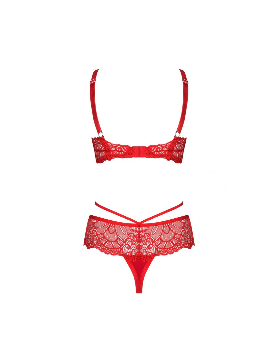Komplet składa się z uroczego biustonosza i stringów, które zostały wykonane z elastycznego materiału dopasowującego się do Twojego ciała. Regulowane ramiączka pozwalają na idealne dopasowanie, a kilkustopniowe zapięcie zapewnia wygodę noszenia. Lekko połyskująca, metalowa zawieszka dodaje elegancji, a elastyczne paseczki ładnie podkreślają dekolt i bioderka. Oryginalny fason stringów o podwyższonym stanie zapewnia wygodę i dodaje seksapilu.