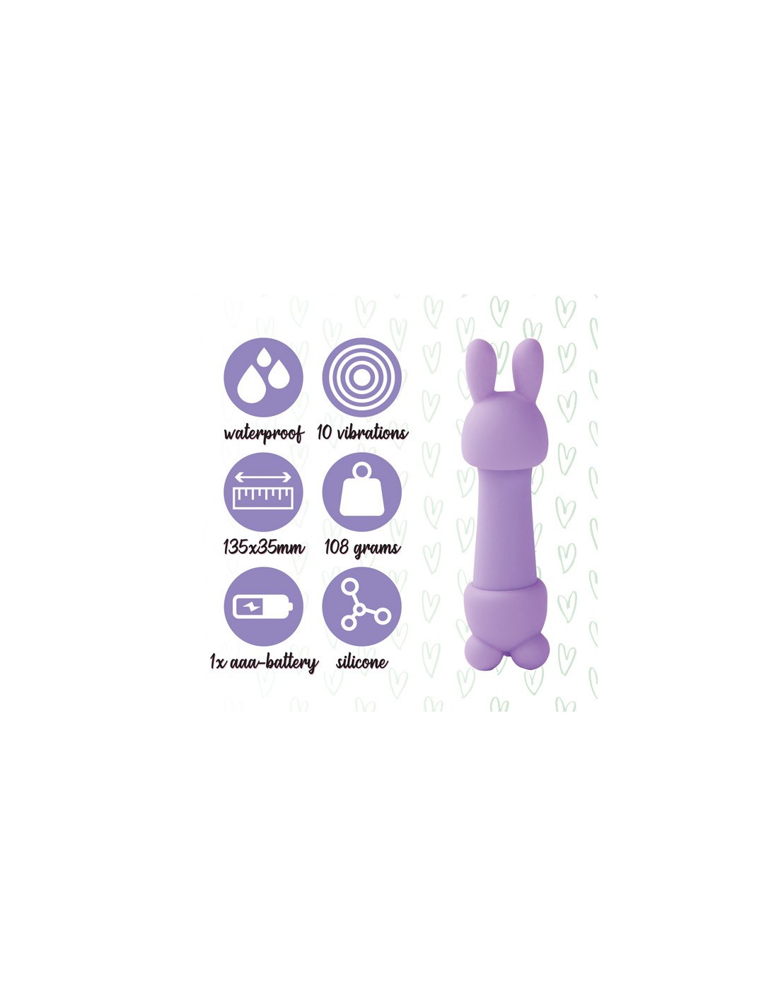 Wibrator Mister Bunny ma kompaktowe wymiary (135mm długości x 35mm średnicy) i wagę zaledwie 108 gramów, dzięki czemu jest idealny do podróży i dyskretnego przechowywania. Dodatkowo, zasilany jest jedną baterią AAA, co sprawia, że jest łatwy w obsłudze i niezawodny.