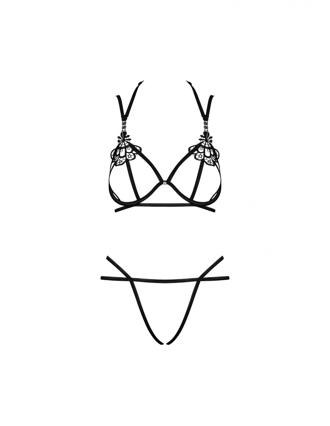 Ten elegancki komplet z pewnością przyciągnie uwagę Twojego partnera. Wyjątkowa gipiura nad piersiami dodaje mu niepowtarzalnego uroku, a otwarty biustonosz z fiszbinami idealnie podkreśla kształty Twojej biustu. To niezwykłe połączenie zmysłowości i wyrafinowania sprawi, że poczujesz się niezwykle kobieco i seksownie.