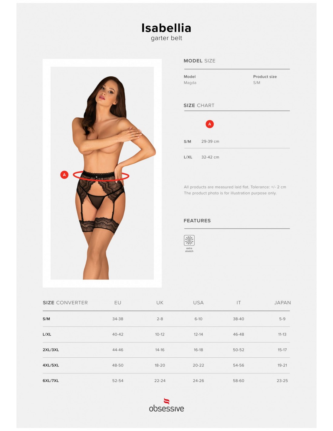 Zmysłowy, czarny pas do pończoch Isabellia to idealne uzupełnienie Twojej kolekcji seksownej bielizny. Jego koronkowy design dodaje Ci niezwykłego seksapilu i sprawia, że Twoje nogi i pośladki wyglądają jeszcze bardziej kusząco. Gotowa na niezapomniane noce pełne gorących wrażeń? Ten pas do pończoch spełni Twoje najskrytsze pragnienia.