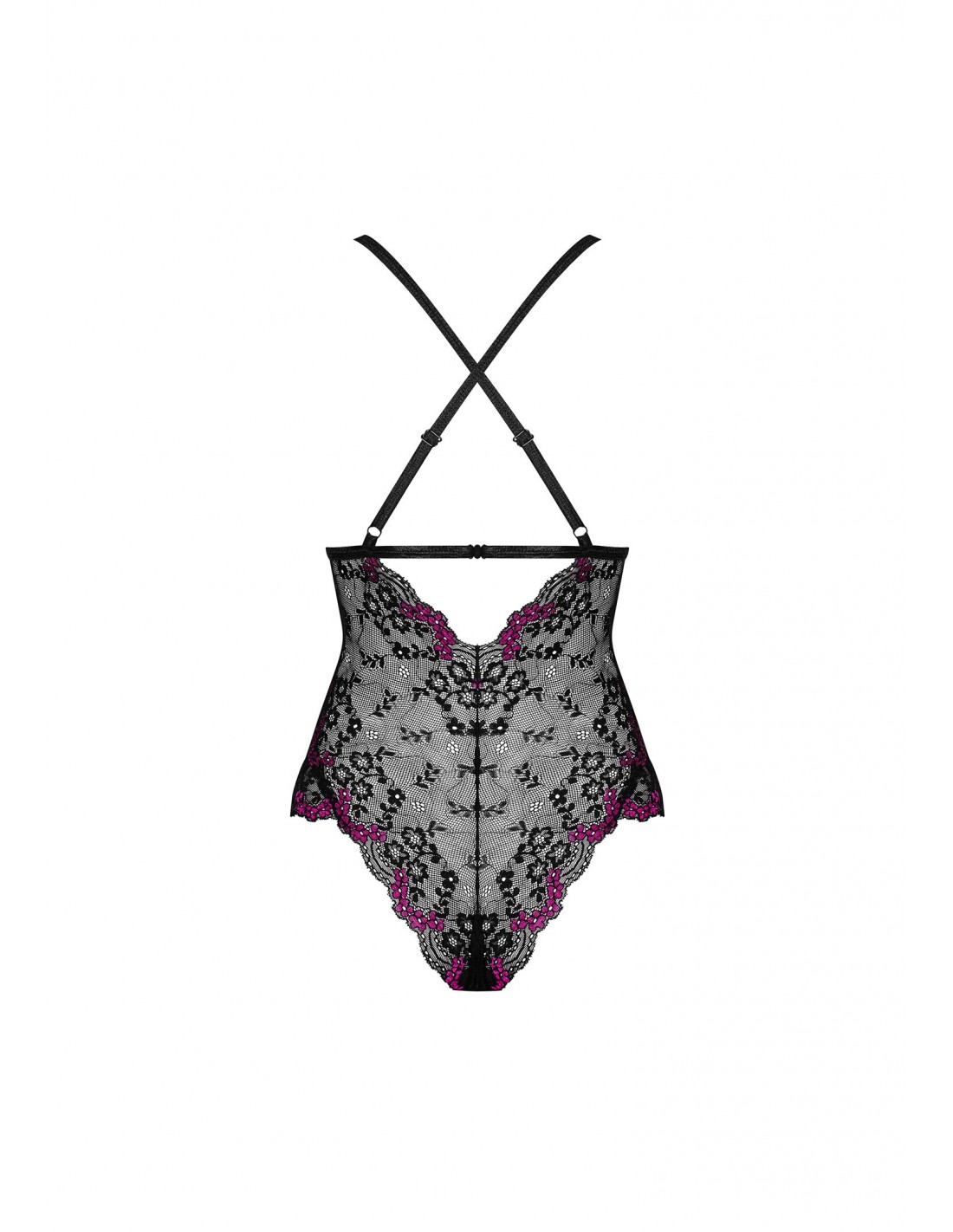 To czarne body z bordowymi elementami to prawdziwa poezja dla zmysłów. Seksowna koronka na plecach dodaje mu niepowtarzalnego uroku i sprawia, że wyglądasz jeszcze bardziej kusząco. Dodatkowo, rozpinane w kroku zapewniają wygodę i łatwość użytkowania.
