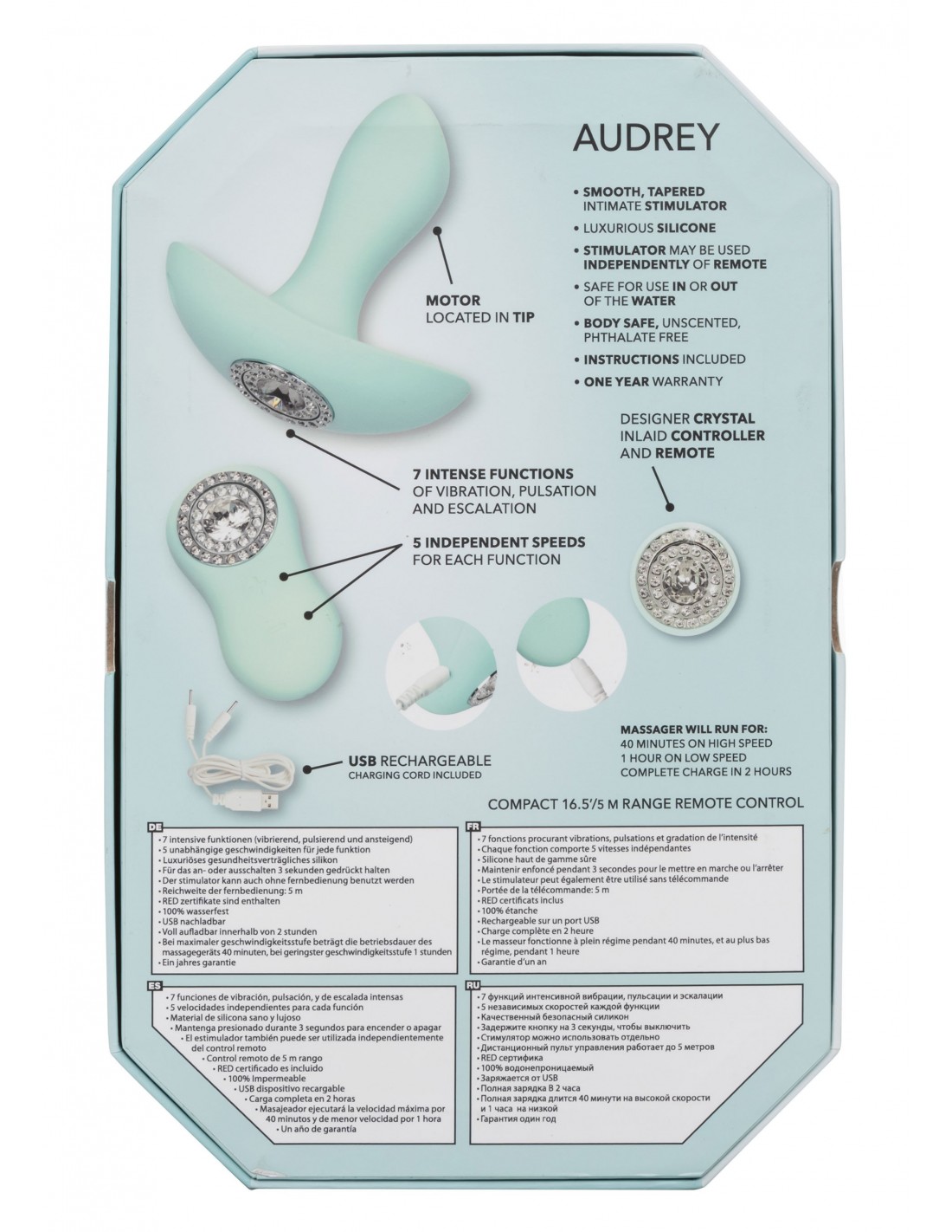 Przejmij kontrolę nad swoją rozkoszą z olśniewającym pilotem zdalnego sterowania, który umożliwia zmianę ustawień z odległości do 32,5 stóp. Czy to romantyczna kąpiel z partnerem czy gorąca sesja solowa, Pavé Audrey dostarczy Ci do 60 minut wodoodpornej wibracji, zapewniając niezapomniane doznania, które zostaną na długo w Twojej pamięci.