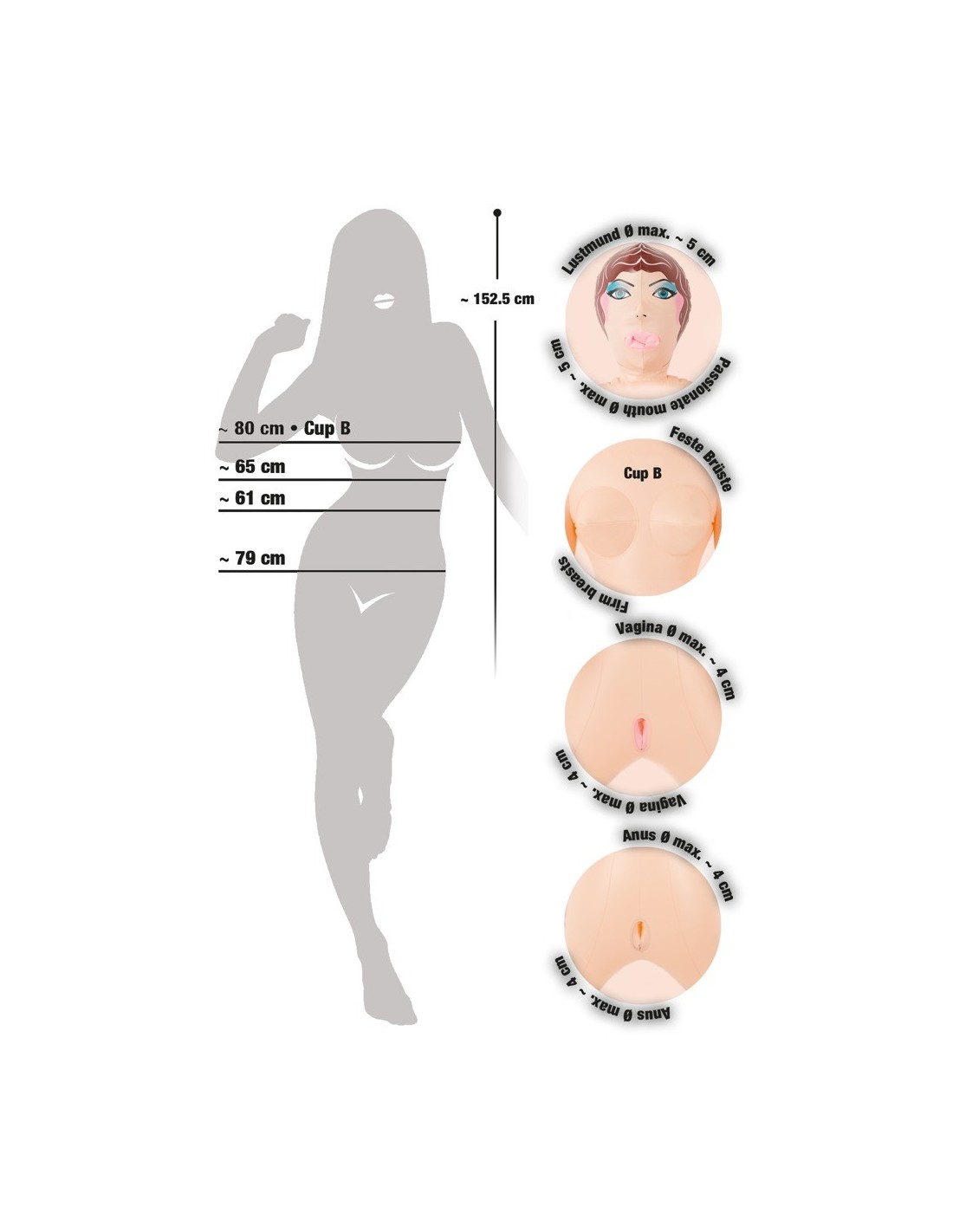 Ta piękna kobieta, z nadrukowaną twarzą i włosami, ma 3 zachęcające i ciasne otwory przyjemności. Stojąc ze zgiętymi ramionami, które są otwarte na uścisk.