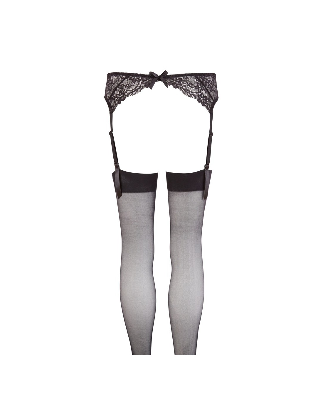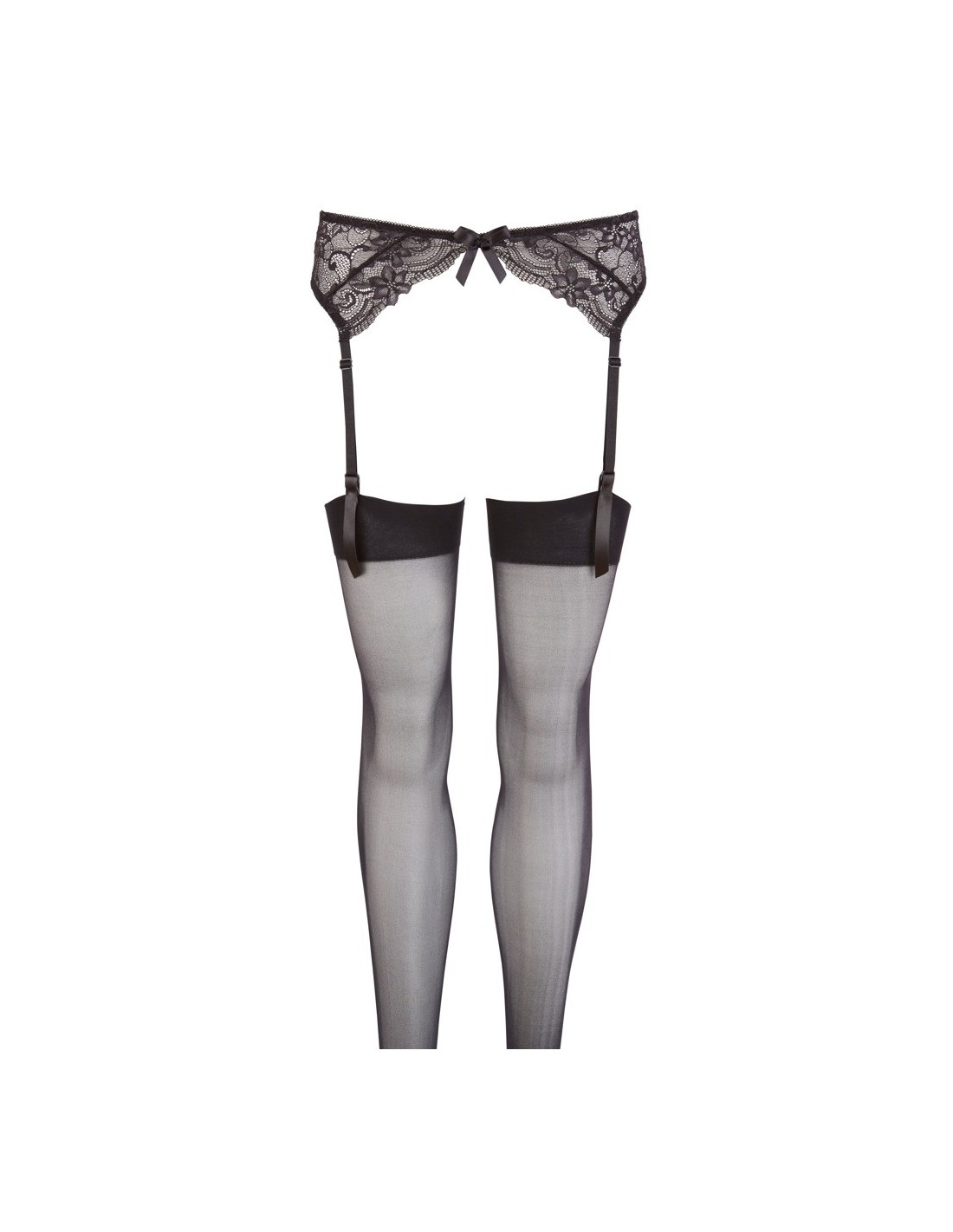 Black koronkowy pasek szelkowy z regulowanymi szelkami. Proste czarne pończochy w zestawie. 100% poliamid.