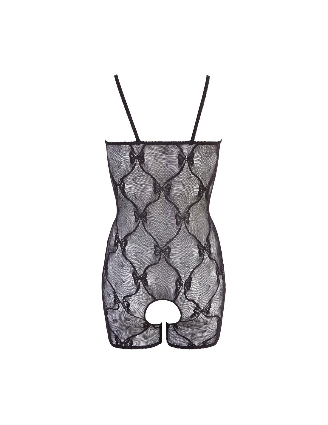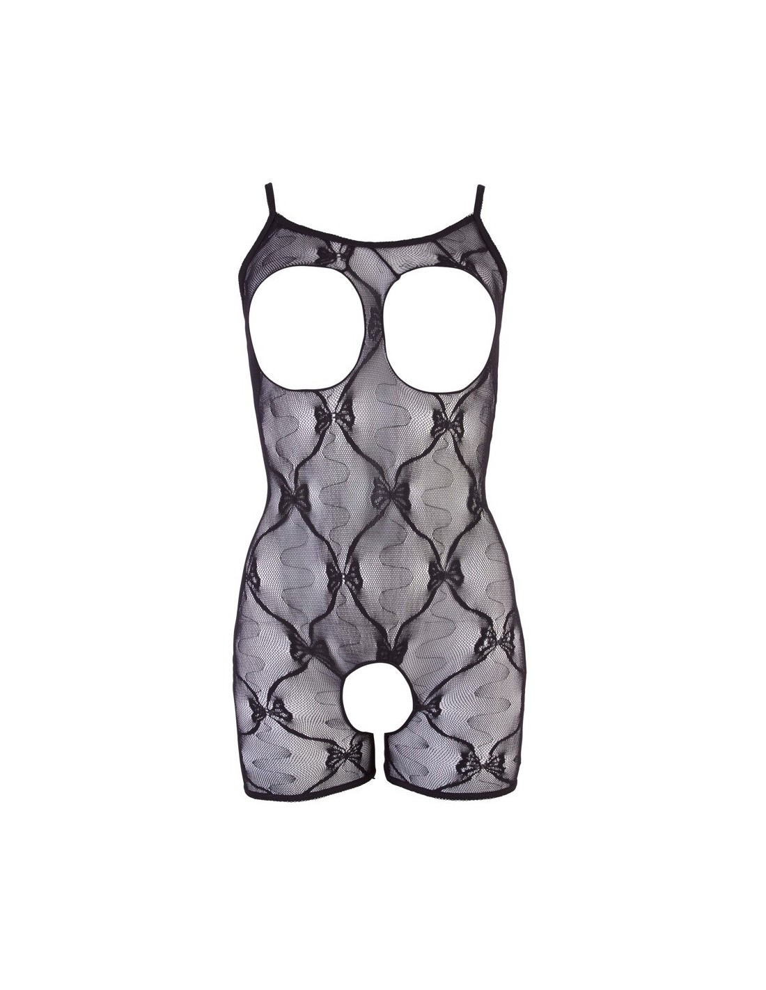 Sexy krótki kombinezon tylko z krótką nogą. Bez krocza i z prowokacyjnymi wizjerami na piersi. Wykonana z elastycznej czarnej koronki. Z wąskimi paskami. W komplecie gaunlety z ramieniem. 100% poliamid.