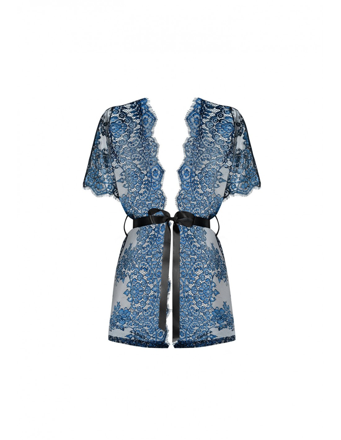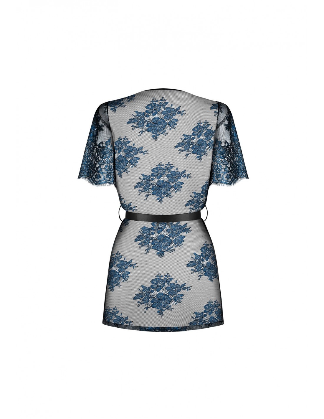 Nasza Yassmyne to połączenie czarującej czerni i uroczego koloru indygo. Koronkowy motyw o kwiecistym wzorze dodaje peniuarowi niepowtarzalnego uroku i kobiecej delikatności. Prześwitujący materiał subtelnie odsłania Twoje wdzięki, podkreślając jednocześnie piękno Twojej sylwetki.