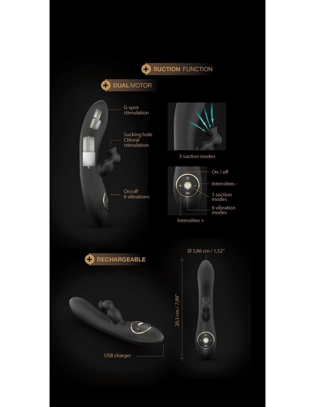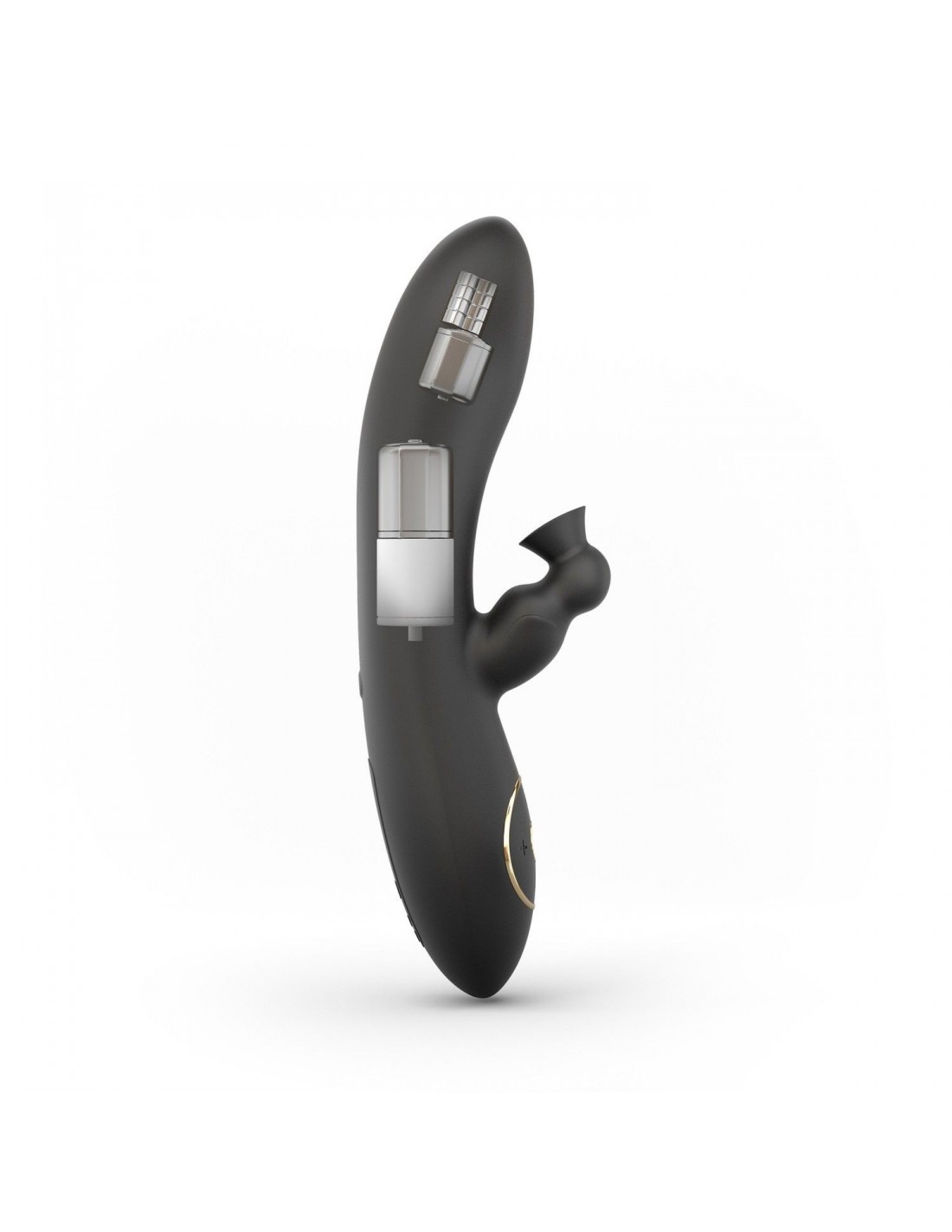 Został wykonany z miękkiego w dotyku czarnego matowego silikonu ze złotym wykończeniem, co sprawia, że jest nie tylko piękny, ale także przyjemny w użyciu. Jego zakrzywiona końcówka precyzyjnie stymuluje punkt G, podczas gdy wystająca część z dziurą zasysającą zapewnia dodatkowe pieszczoty oralne.