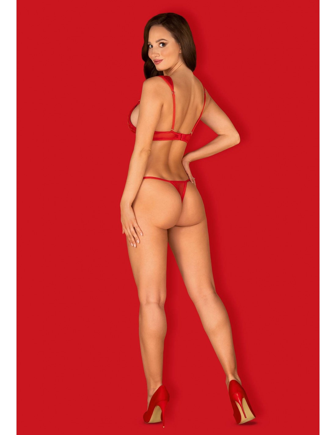 Komplet Hunteria składa się z biustonosza i stringów, które idealnie podkreślą Twoje kobiece kształty. Trójkątne miseczki biustonosza pięknie eksponują Twoje piersi, podczas gdy regulowane ramiączka zapewniają pełen komfort noszenia. Dodatkowo, biustonosz posiada regulowane zapięcie na plecach, co umożliwia dopasowanie do Twojego ciała. Wyjątkowym elementem są również ramiączka z dodatkową wstawką materiału na ramionach, które dodają kompletowi wyjątkowego charakteru.