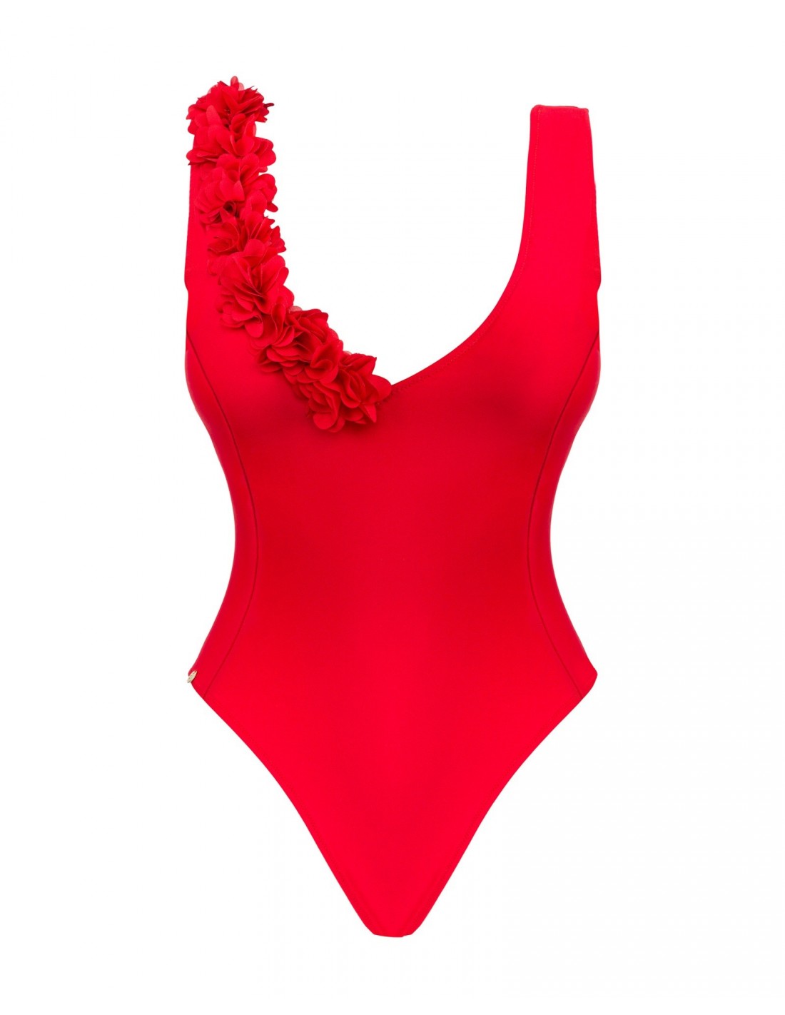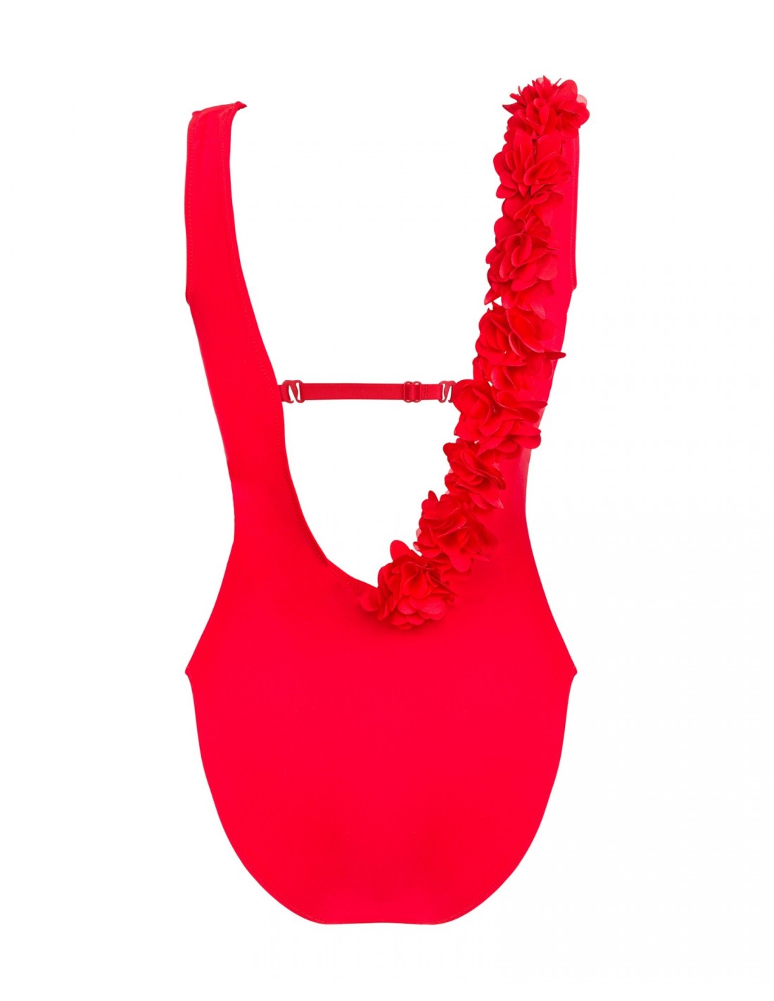 -czerwony, jednoczęściowy kostium kąpielowy z uwodzicielskim dekoltem