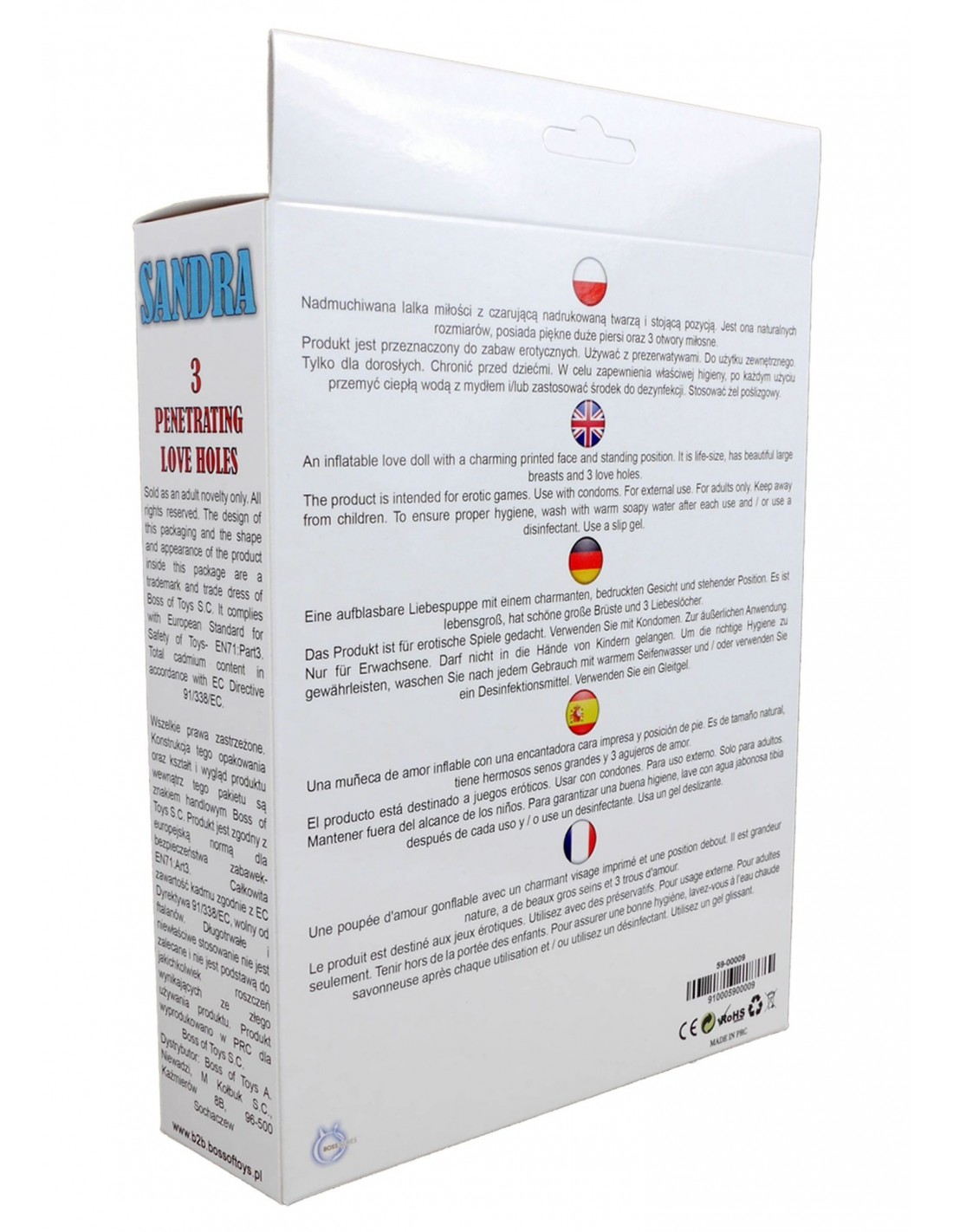 Piękna nadmuchiwana lalka miłości z czarującą nadrukowaną twarzą i stojącą pozycją, która kusi i wzbudza sensację. Jest ona naturalnych rozmiarów, posiada duże piękne piersi i 3 kuszące dziurki miłosne.