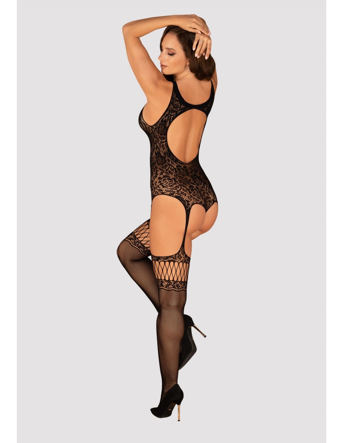 Otul swoje ciało seksowną, miłą w dotyku dzianiną i rozpocznij pełen namiętności wieczór, który na długo pozostanie w Twojej pamięci! Ten ultra kobiecy bodystocking to połączenie gorsetu i pończoch, które gwarantuje niegrzeczne przyjemności. Jego zmysłowy, kwiatowy wzór dodaje elegancji, a kuszące wycięcie na plecach stanowi czarujący element. Głębokie wycięcie na przodzie zdobione krzyżującymi się paseczkami zapewnia efekt wow! Dzięki miłej w dotyku dzianinie, Twój wygląd sylwetki będzie piękny, a otwarty krok doda pikanterii. Wybierz bodystocking F236 S/M/L i rozbudź swoją wyobraźnię już dziś!