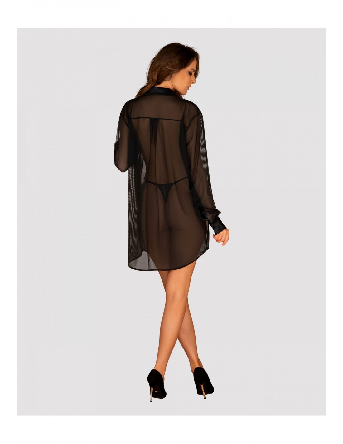 Ta długa babydoll w czerni sięga lekko za pośladki, co dodaje jej niezwykłego uroku. Delikatny, prześwitujący materiał ożywi Twoją wyobraźnię i pobudzi zmysły. Satynowe wstawki na mankietach i wzdłuż sylwetki dodają szykownego elementu, podkreślając Twoją kobiecość.