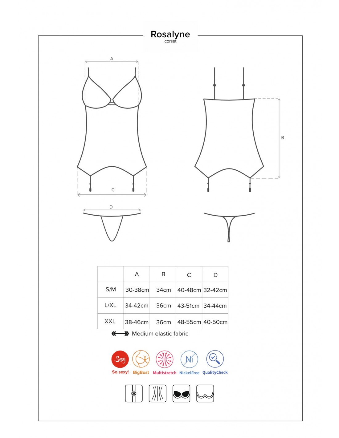 Gorset Rosalyne i pasujące do niego stringi to kompletny zestaw, który idealnie uzupełni Twoją garderobę. Wykonane z miękkiego i przyjemnego w dotyku materiału Multistretch (85% poliamid, 15% elastan), zapewnią Ci nie tylko wygodę, ale także niezapomniany wygląd.