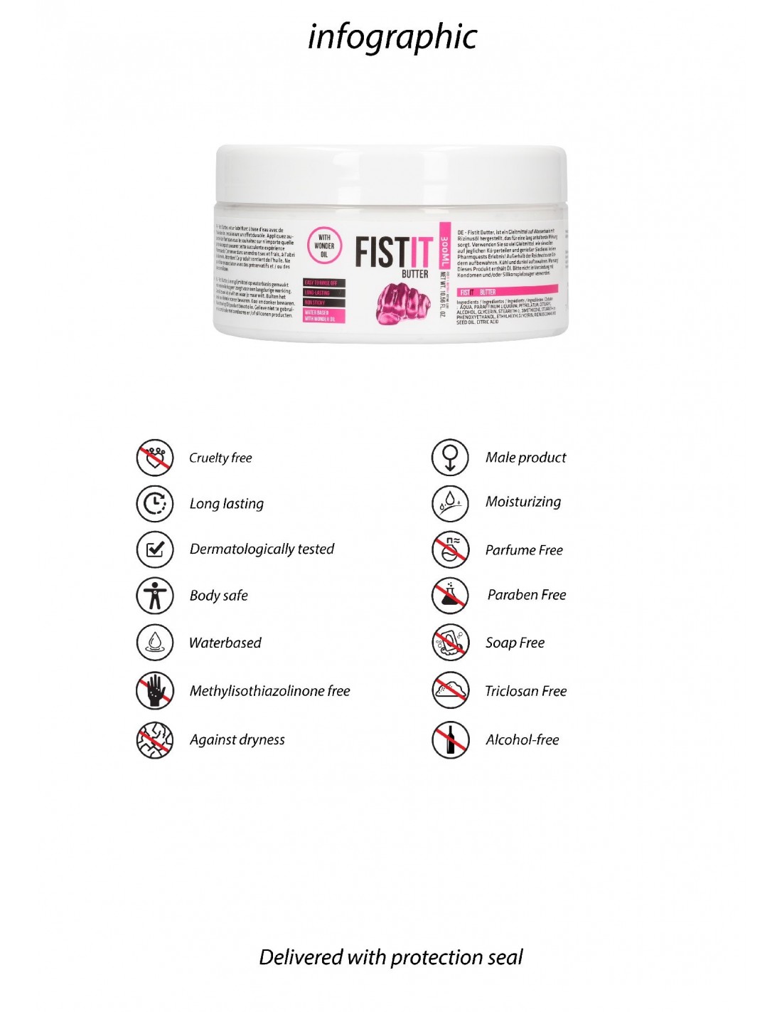 Przed użyciem żelu do fistingu Fist IT Butter pamiętaj, że zawiera on olejek. Dlatego nie zalecamy stosowania go w połączeniu z prezerwatywami i/lub zabawkami silikonowymi. Dbamy o Twoje bezpieczeństwo, dlatego zawsze zalecamy czytanie etykiety i instrukcji przed użyciem.