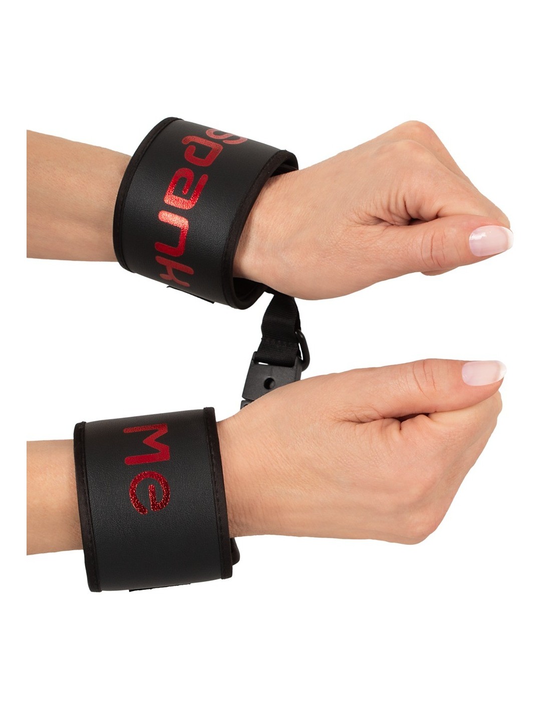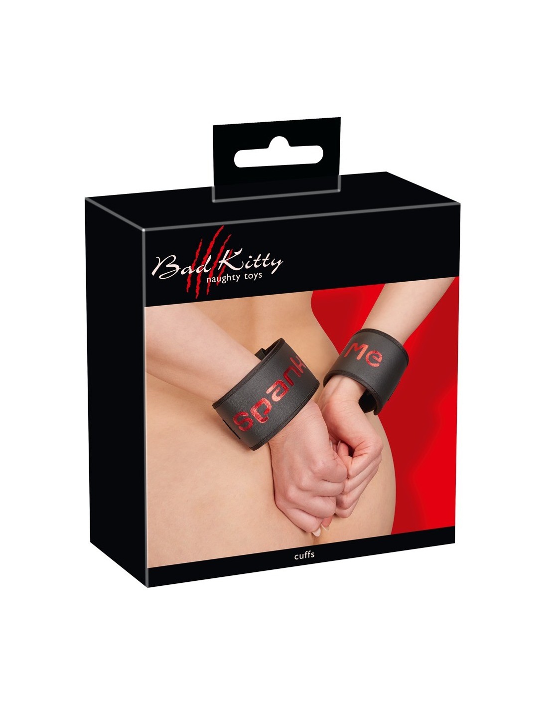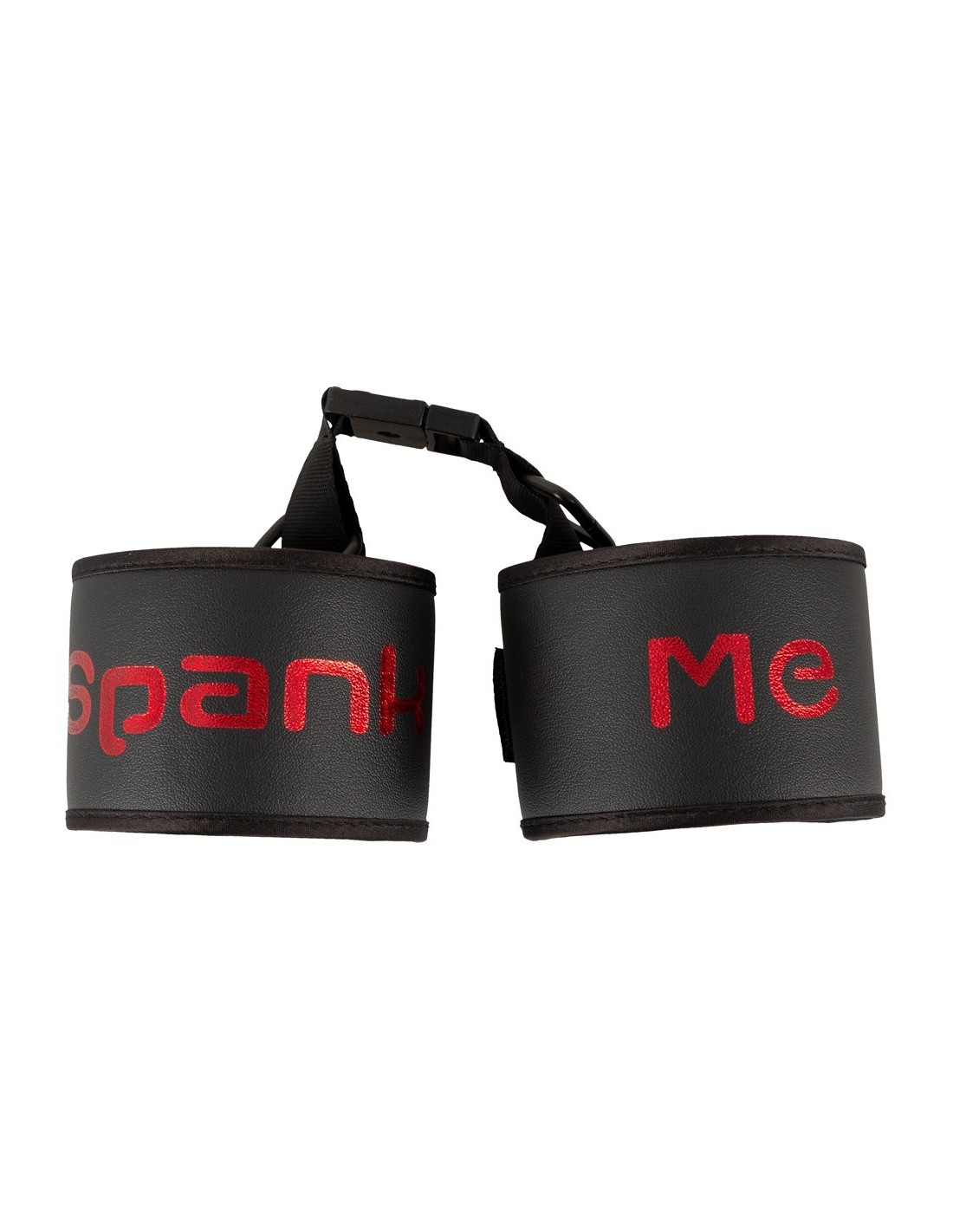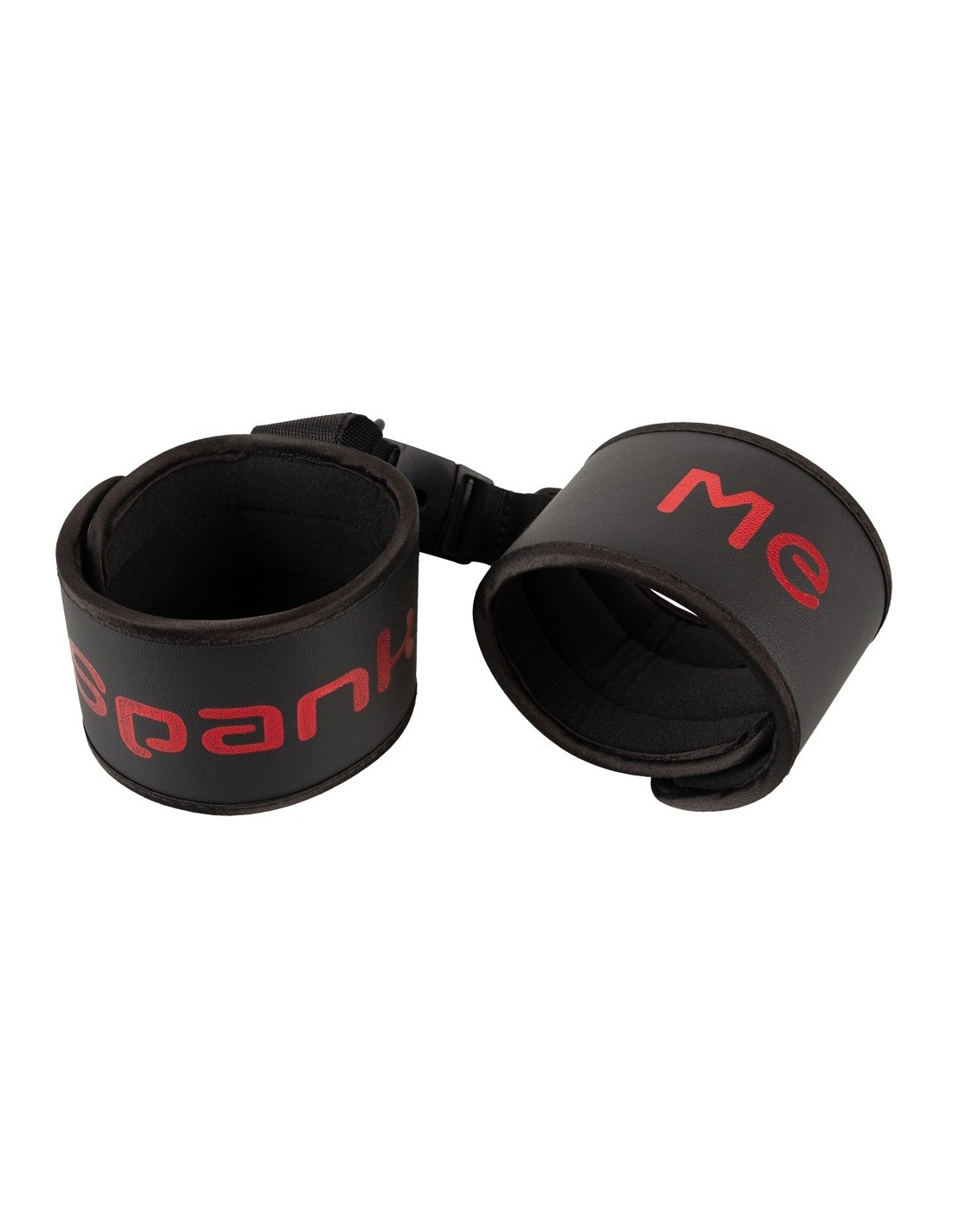 Soft handcuffs Spank me Cuffs from Bad Kitty that are connected by a soft fabric-covered strap with a practical clip fastener. Black with the text "Spank Me" in red. Bondage restraints with hook and loop fasteners. They can be adjusted and are quickly put on and taken off.