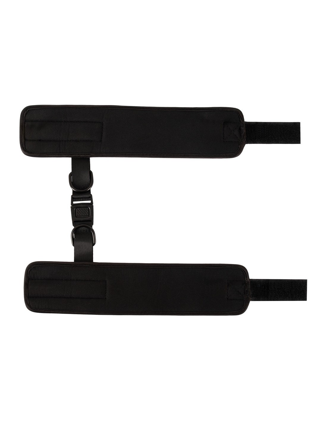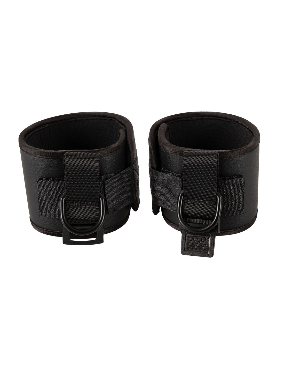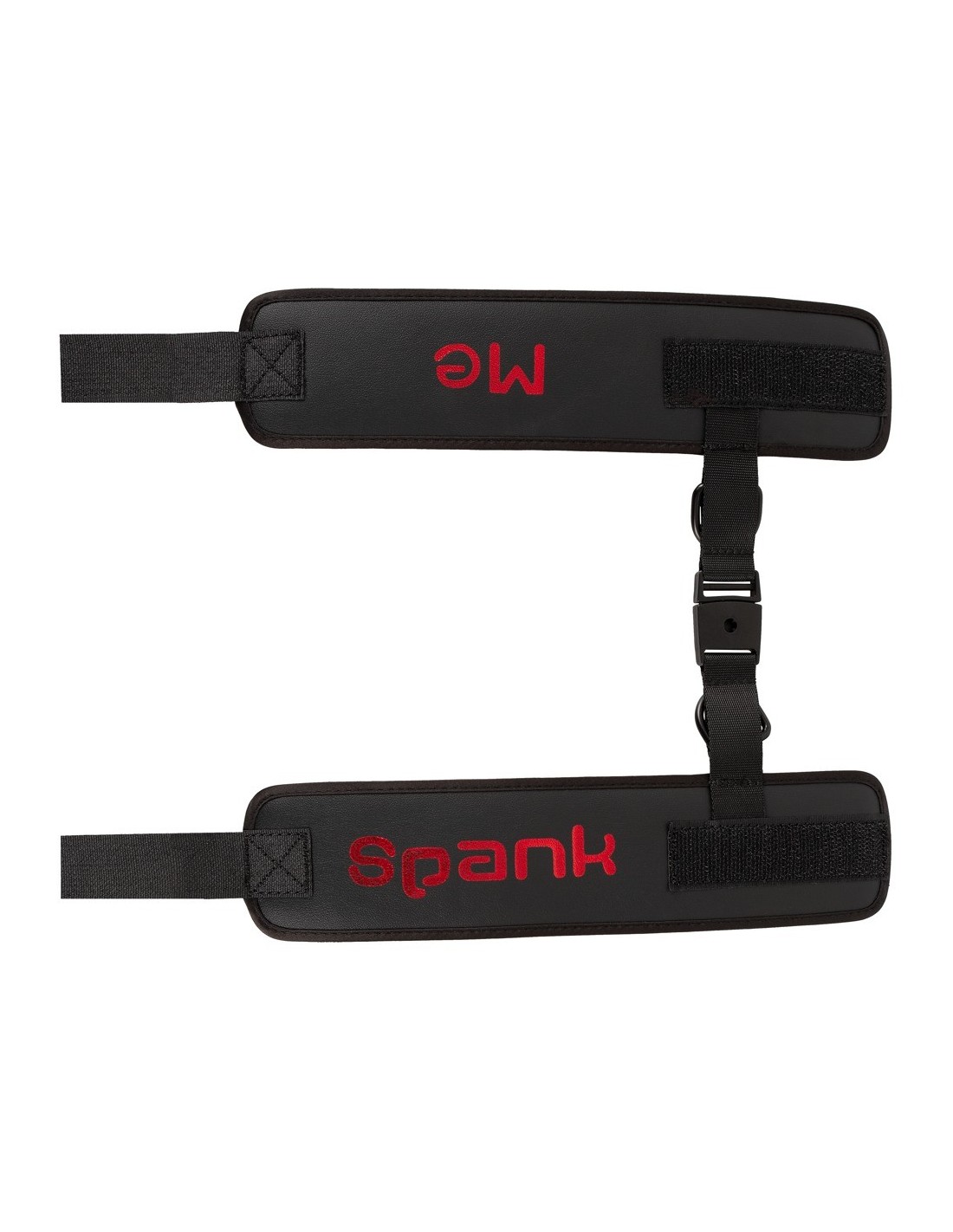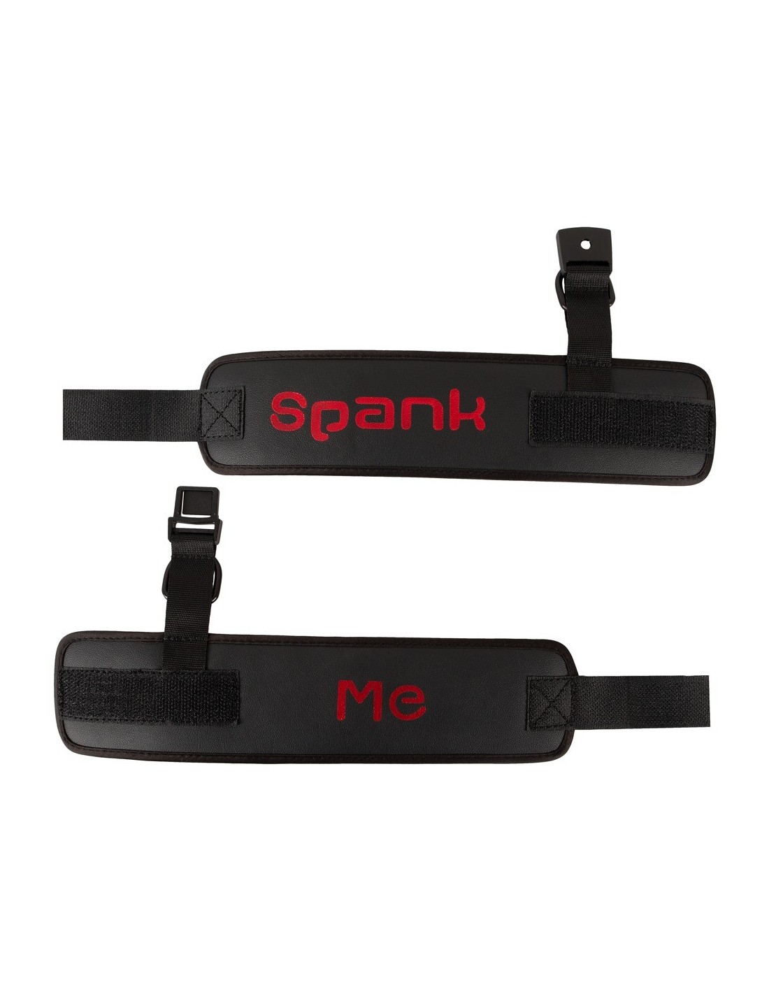 Soft handcuffs Spank me Cuffs from Bad Kitty that are connected by a soft fabric-covered strap with a practical clip fastener. Black with the text "Spank Me" in red. Bondage restraints with hook and loop fasteners. They can be adjusted and are quickly put on and taken off.