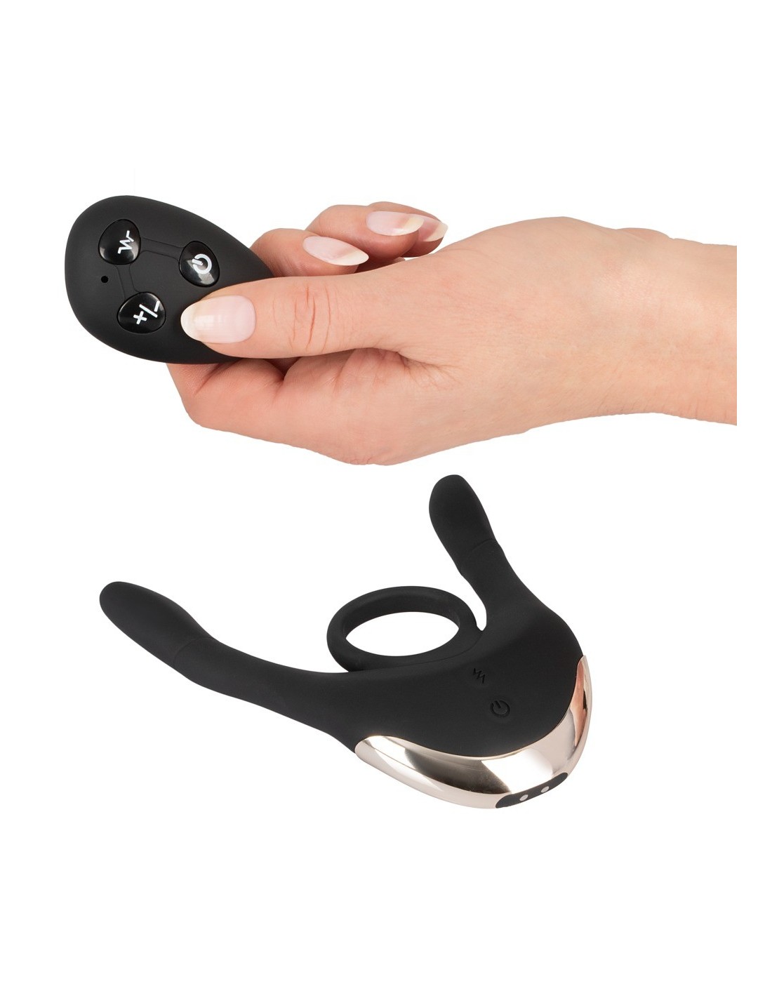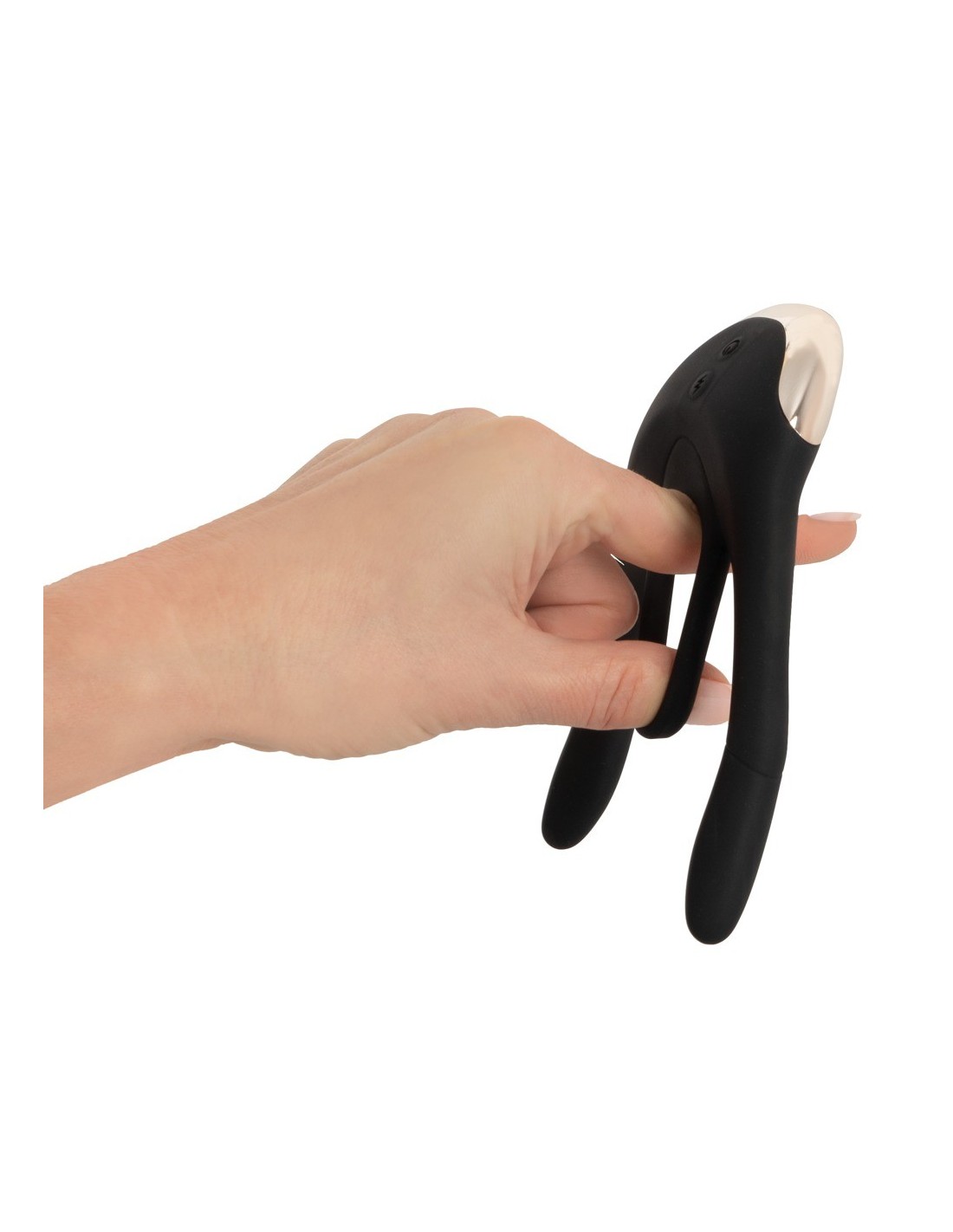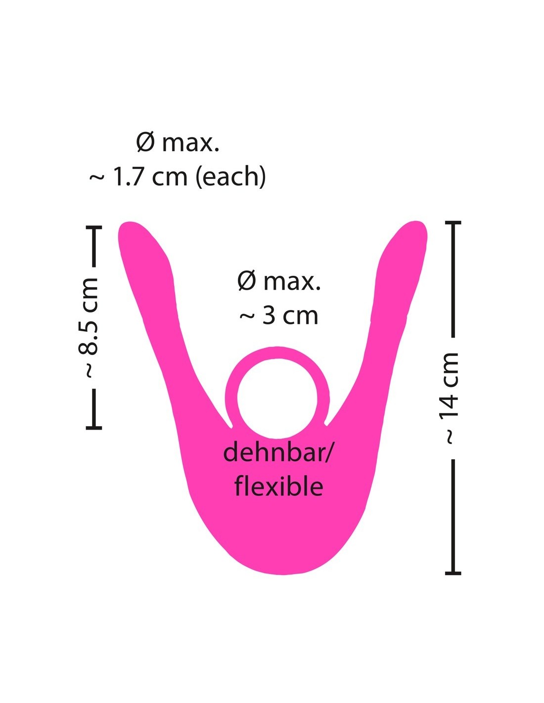 Długiełka 14 cm;każde ramię: długość wkładki 8,5 cm, ? maks. 1,7 cm;pierścień? 3 cm (elastyczny), grubość 0,4 cm. Waga 100 g. Silikonowy PU, ABS. Zawiera baterię (CR2032) do pilota zdalnego sterowania.