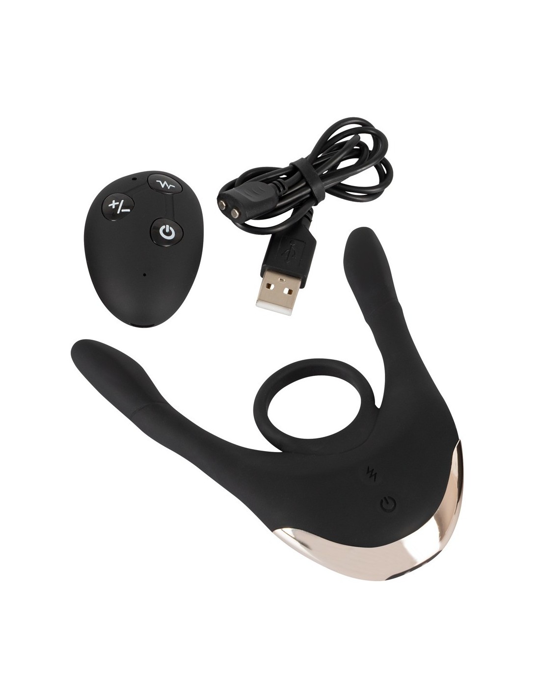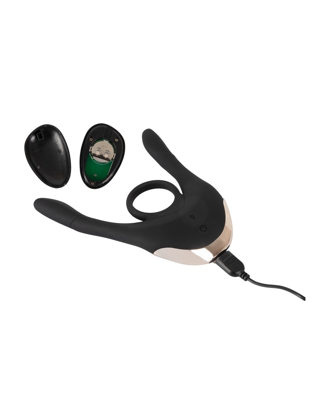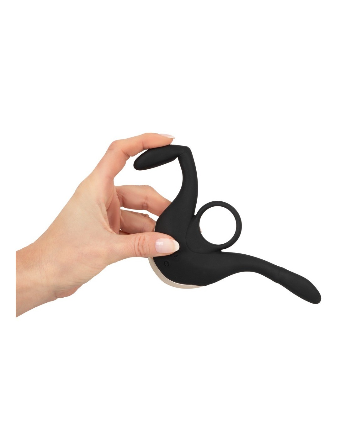Długiełka 14 cm;każde ramię: długość wkładki 8,5 cm, ? maks. 1,7 cm;pierścień? 3 cm (elastyczny), grubość 0,4 cm. Waga 100 g. Silikonowy PU, ABS. Zawiera baterię (CR2032) do pilota zdalnego sterowania.
