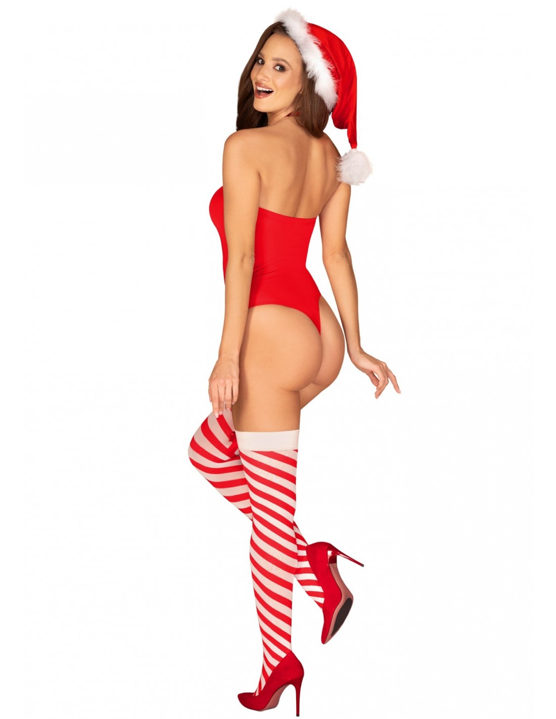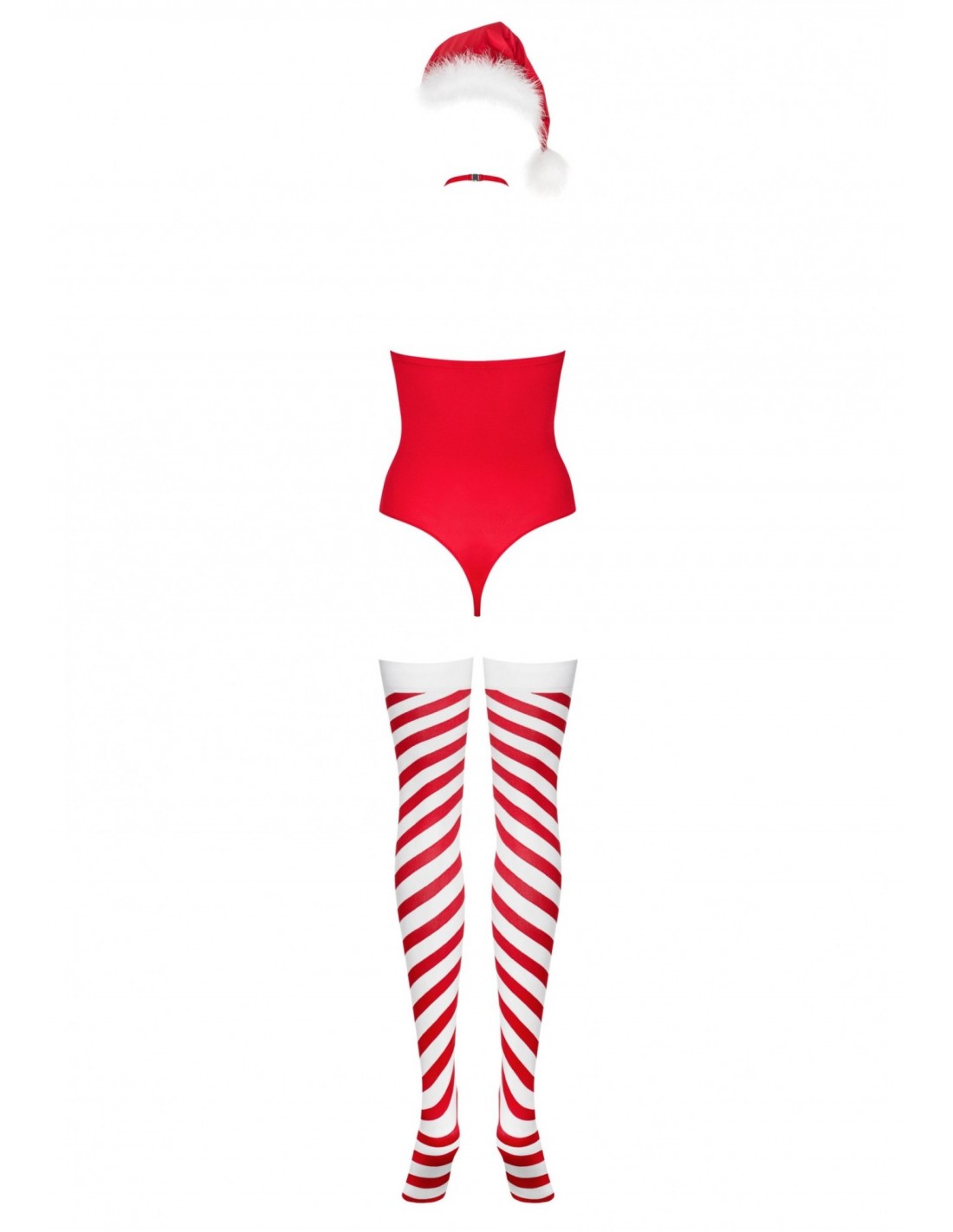 Ale to nie koniec! W zestawie znajdziesz również czapkę Mikołajki, która dodaje całości świątecznego uroku, oraz pończochy Kissmas, które podkreślają piękno Twoich nóg. Nie musisz się martwić o kompletność zestawu, ponieważ w jego skład wchodzą: body, choker, czapka oraz pończochy.