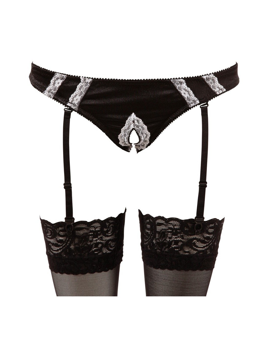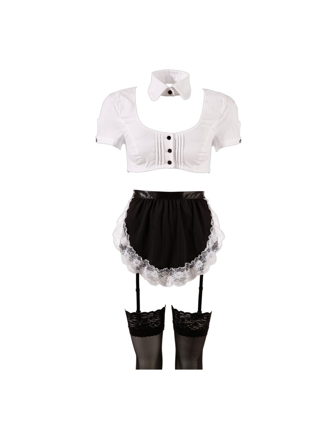 Ten zestaw zawiera wszystko, czego potrzebujesz, aby stworzyć niesamowity look. Składa się z krótkiego topu, figi z otwartym krokiem, pończoch, fartucha, opaski na głowę i falbaniastego chokera. Top i choker wykonane są z 98% bawełny i 2% elastanu, fartuch i opaska na głowę z 90% poliestru i 10% elastanu, a pończochy z 100% poliamidu. Kolorystyka zestawu to czarno-biały, co dodaje mu elegancji i seksapilu.
