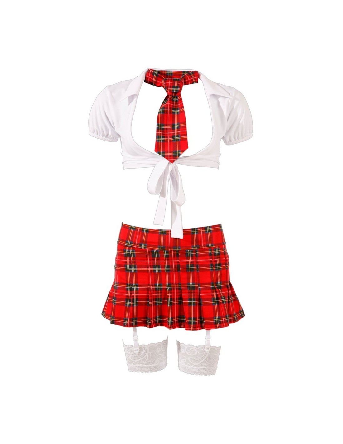 Ten zestaw składa się z krótkiej bluzki do zawiązania, plisowanej mini spódniczki oraz kuszącego wycięcia na plecach, które pozwolą Ci odkryć urocze falbanki na regulowanych podwiązkach. Zamek błyskawiczny z tyłu zapewnia łatwe zakładanie i zdejmowanie. Do kompletu dołączony jest także krótki krawat oraz pończochy z koronkowym wykończeniem (100% poliamid). Kolor: biały i czerwono-zielona kratka. Materiał: 92% poliester, 8% elastan.