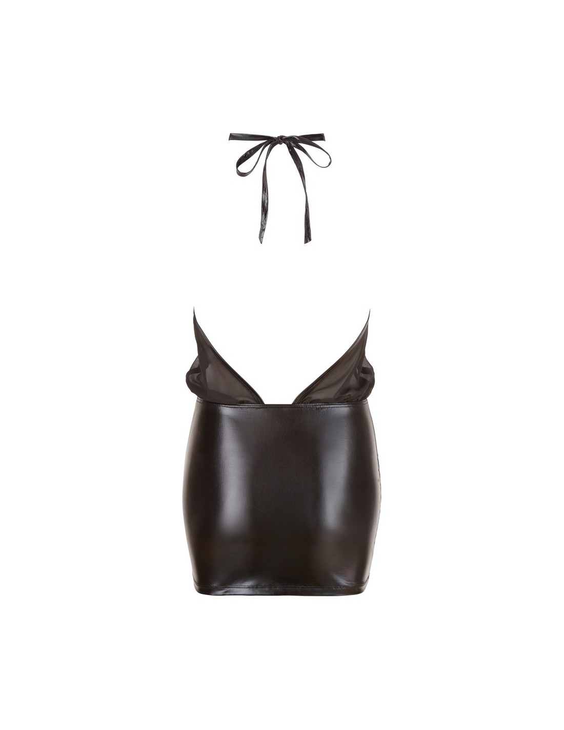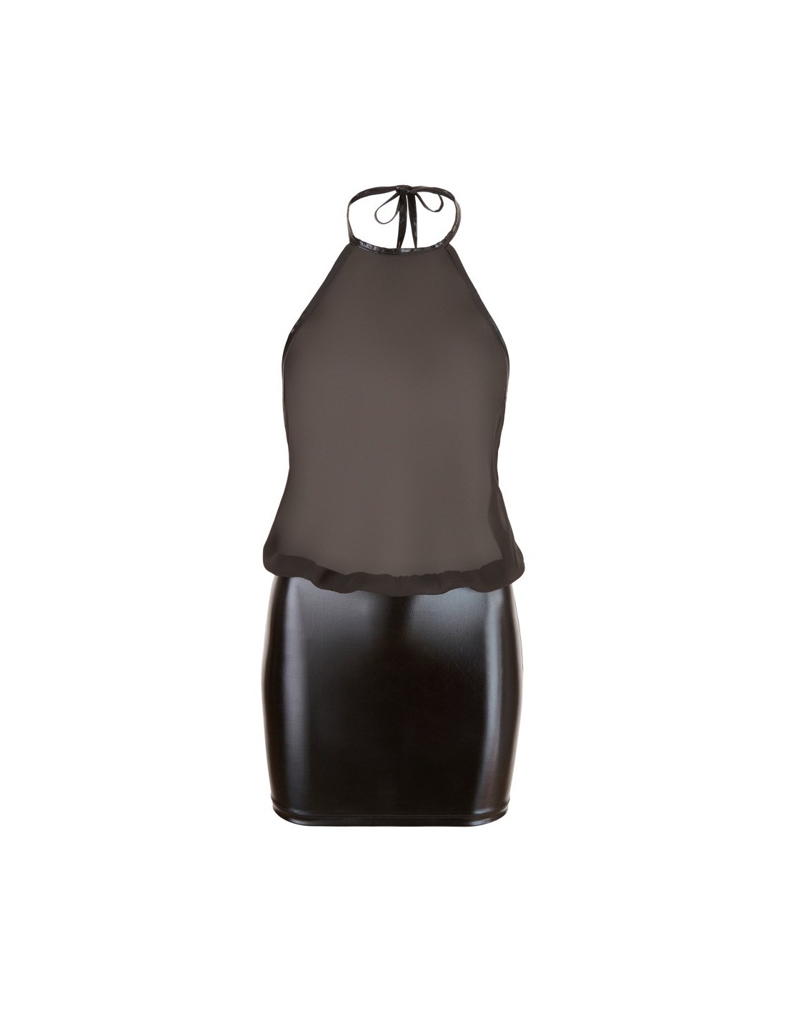Poszukujesz czegoś, co sprawi, że poczujesz się wyjątkowo seksownie i pewnie siebie? Ta czarna sukienka z pewnością spełni Twoje oczekiwania! Jej halterowy dekolt, który wiąże się z tyłu, dodaje jej niezwykłego uroku. To sukienka z wysokim kołnierzem, całkowicie odkrytymi plecami. Jej połyskująca, mokra faktura podkreśla Twoje krągłości, podczas gdy przezroczysta góra z delikatnego tiulu jest luźna i seksowna. To naprawdę gorące połączenie!