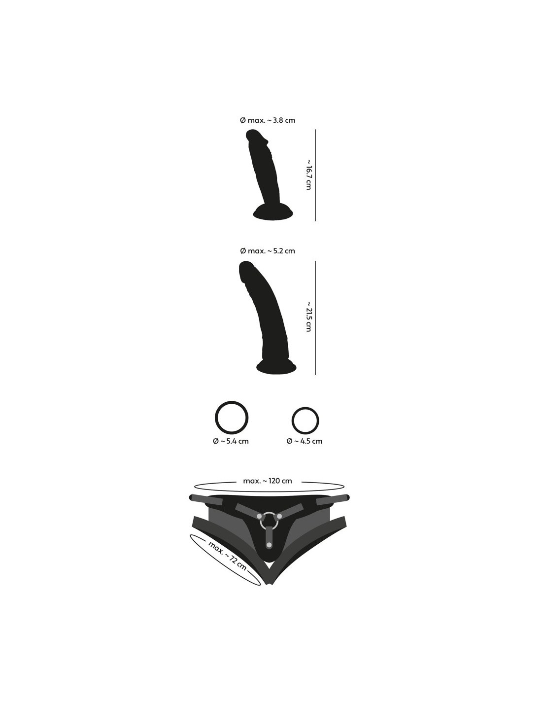 Zestaw zawiera dwa dildo o różnych rozmiarach, które są w kształcie realistycznego penisa. Dildo ma przyssawkę, dzięki czemu można je używać samodzielnie, a nawet bez użycia rąk. Dildo SMALL ma długość 16,7 cm i maksymalną średnicę 3,8 cm, natomiast dildo LARGE ma długość 21,5 cm i maksymalną średnicę 5,2 cm. Oba dilda można łatwo zamontować i zdjąć z pasów, co daje Ci pełną swobodę w eksperymentowaniu i dostosowaniu do swoich preferencji.