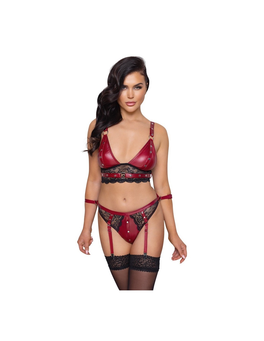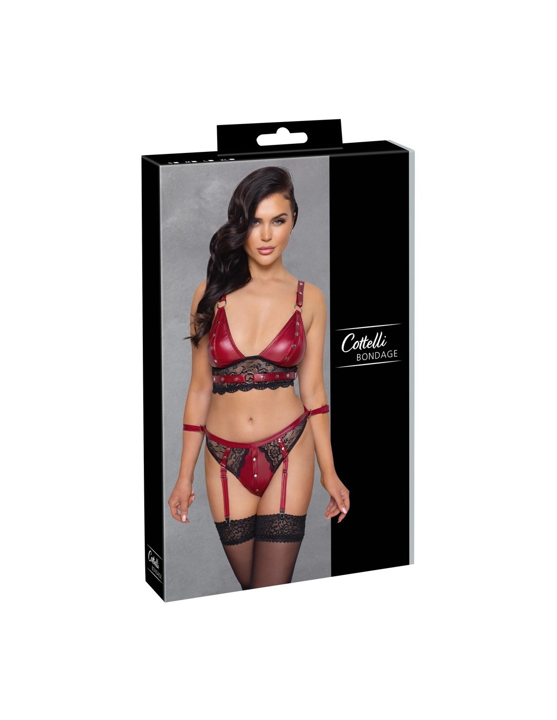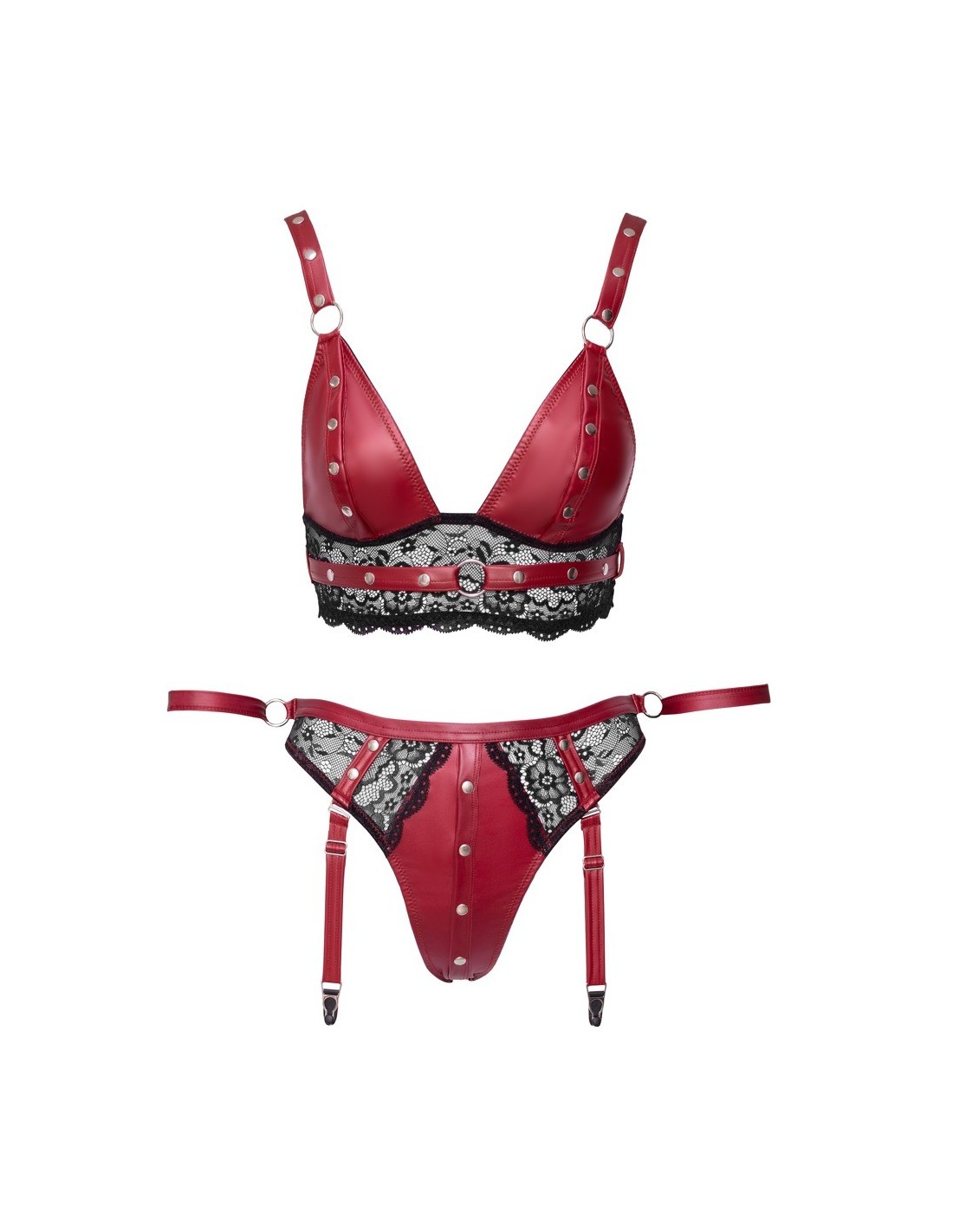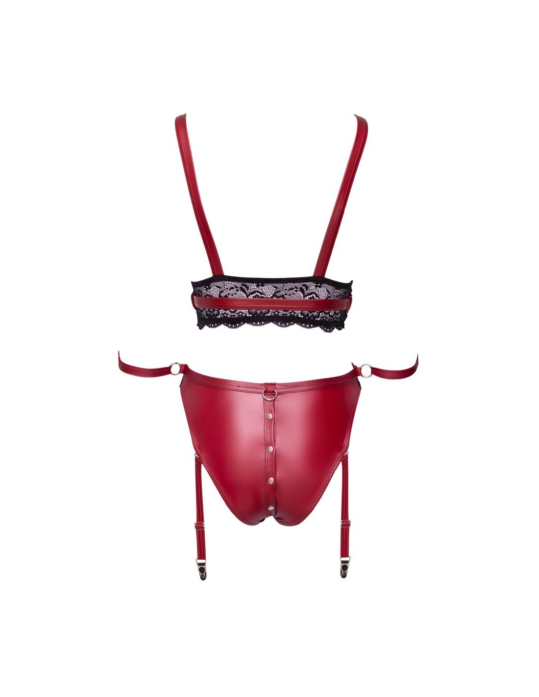 Ten niezwykły zestaw składa się z uwodzicielskiego bralette i zmysłowych fig. Wykonany z pięknej czerwonej tkaniny o matowym wykończeniu, ozdobiony delikatnymi czarnymi koronkowymi wstawkami i srebrzystymi metalowymi elementami, zapewnia niezapomniane wrażenia w trakcie każdej sesji bondage.