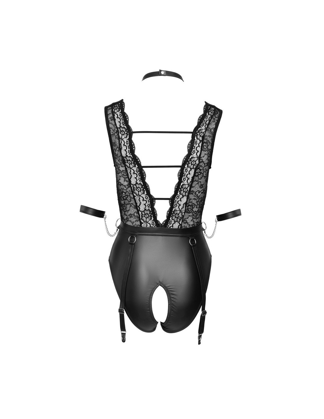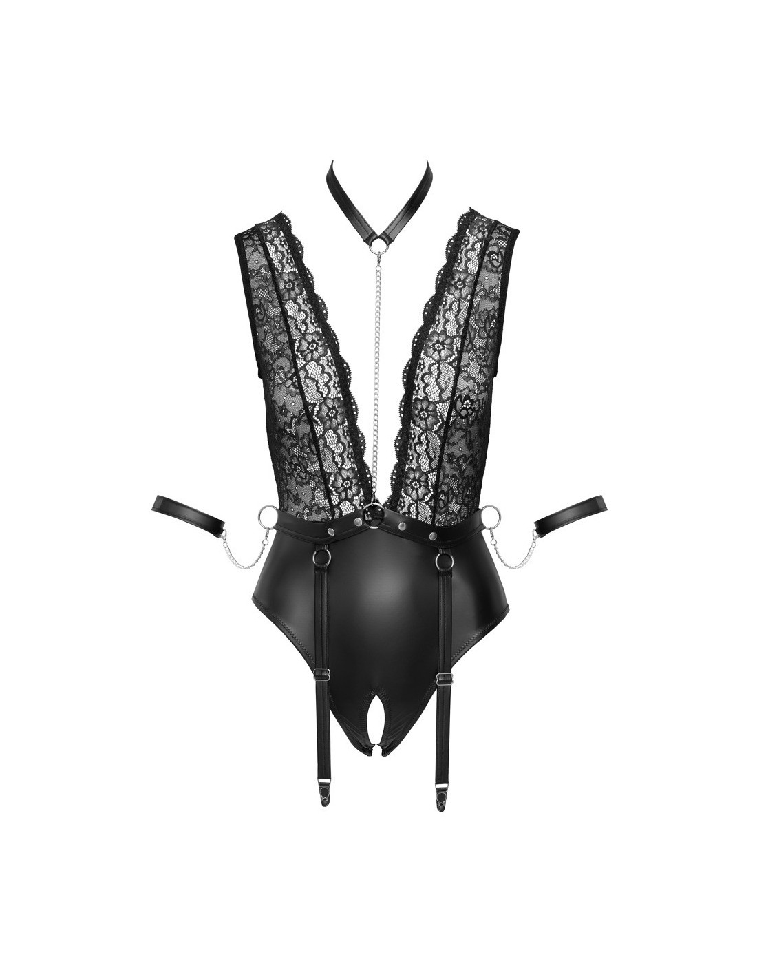 To body z efektem podwiązki posiada bardzo głęboko wycięty dekolt, przezroczystą górną część wykonaną z delikatnej koronki oraz kroczowy element z pięknego matowego materiału. Tył również ma dekolt w kształcie litery V, z elastycznymi paskami, które trzymają całość razem. Paski podwiązek są przymocowane do pierścieni na pasku. Kołnierz i przedni pierścień paska można połączyć za pomocą łańcuszka z karabińczykiem. Pierścienie po bokach body mogą służyć do przymocowania dołączonych kajdanek za pomocą łańcuszków z karabińczykami. Pasek i paski podwiązek można regulować, a także odłączyć. Kajdanki można regulować za pomocą rzepów. Skład materiałowy to 90% poliester, 10% elastan; koronka 90% poliamid, 10% elastan. Skarpetki nie są dołączone.