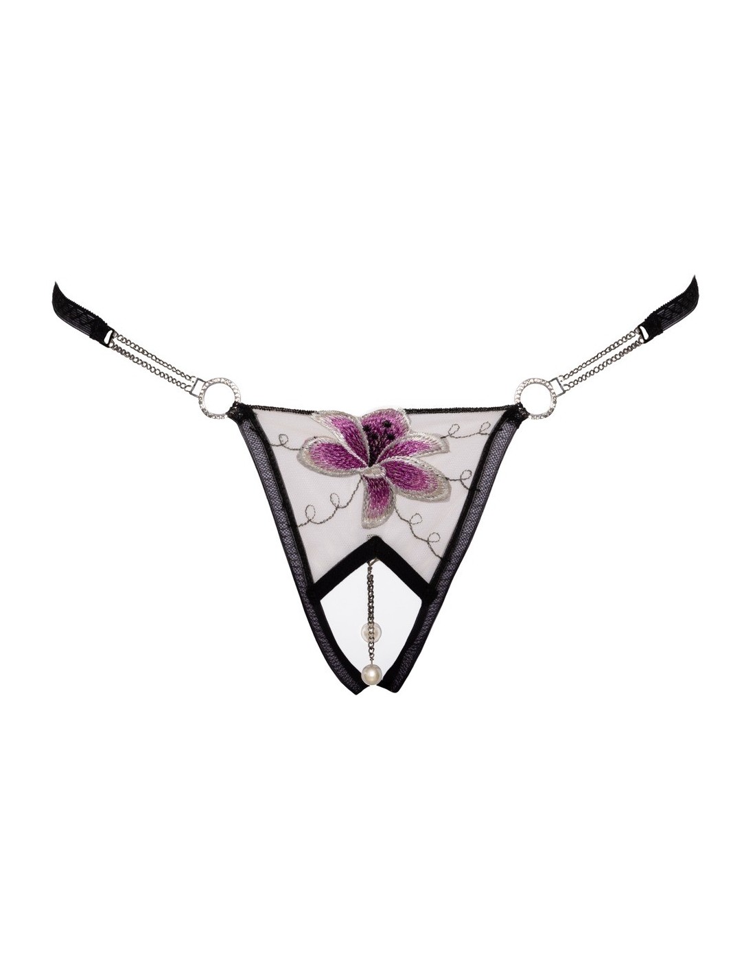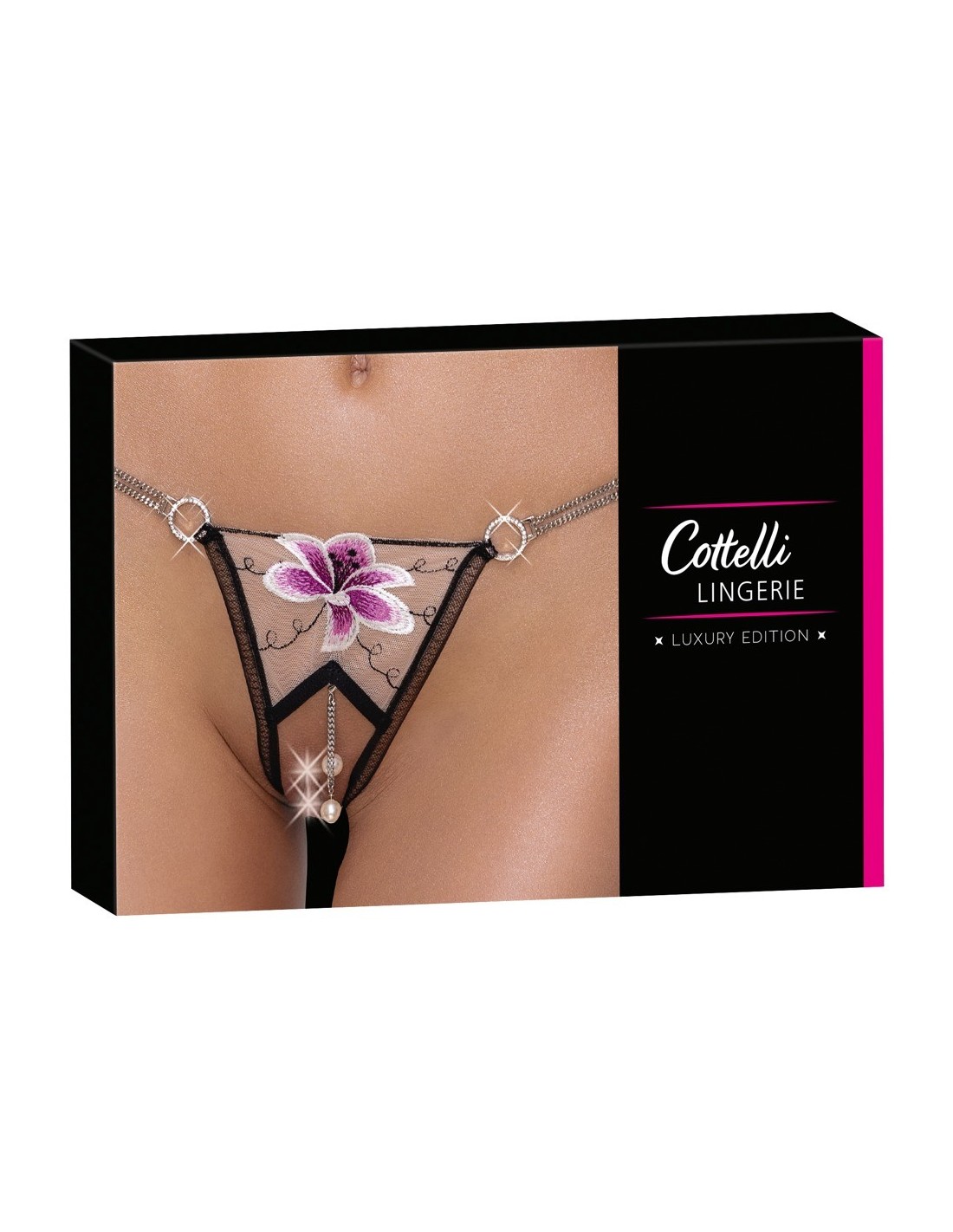 Przedstawiamy nasze najnowsze stringi erotyczne - String Flower S/M, stworzone przez renomowanego producenta Cottelli LINGERIE. Te uwodzicielskie stringi wykonane są z delikatnej siateczki tiulowej, a ich największym atutem jest przepiękny kwiat i delikatny haft umieszczony z przodu, w okolicy kusząco otwartej kroczki. Dodatkowo, w dwóch miejscach znajdują się małe, delikatnie kołyszące się łańcuszki ozdobione perłami, które nie tylko zdobią, ale również dostarczają niezapomnianych doznań - są również wymienne. Elastyczna gumka w pasie ozdobiona jest łańcuszkami z kryształkami i pierścieniami z przodu (po obu stronach). Na tyle znajduje się elastyczny wstawka z siateczki powernet, zapewniająca idealne dopasowanie. Stringi wykonane są z wysokiej jakości materiałów: 100% poliamidu, a wstawka powernetowa z 90% poliamidu i 10% elastanu.