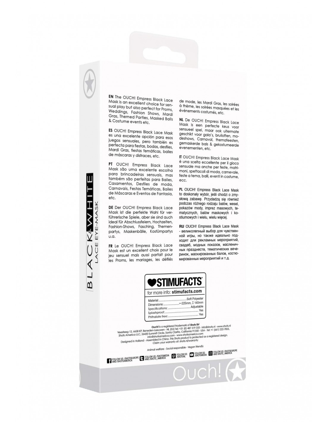 Maskę trzymają w miejscu dwie wstążki wysokiej jakości, które zapewniają idealne dopasowanie i komfort noszenia przez długie godziny. Dzięki nim nie musisz martwić się o uwieranie czy przesuwanie się maski podczas Twojej zmysłowej zabawy. OUCH! Empress Black Lace Mask to nie tylko idealny dodatek do intymnych chwil, ale również doskonały element stroju na różnego rodzaju wydarzenia, takie jak bale, wesela, pokazy mody czy imprezy tematyczne.