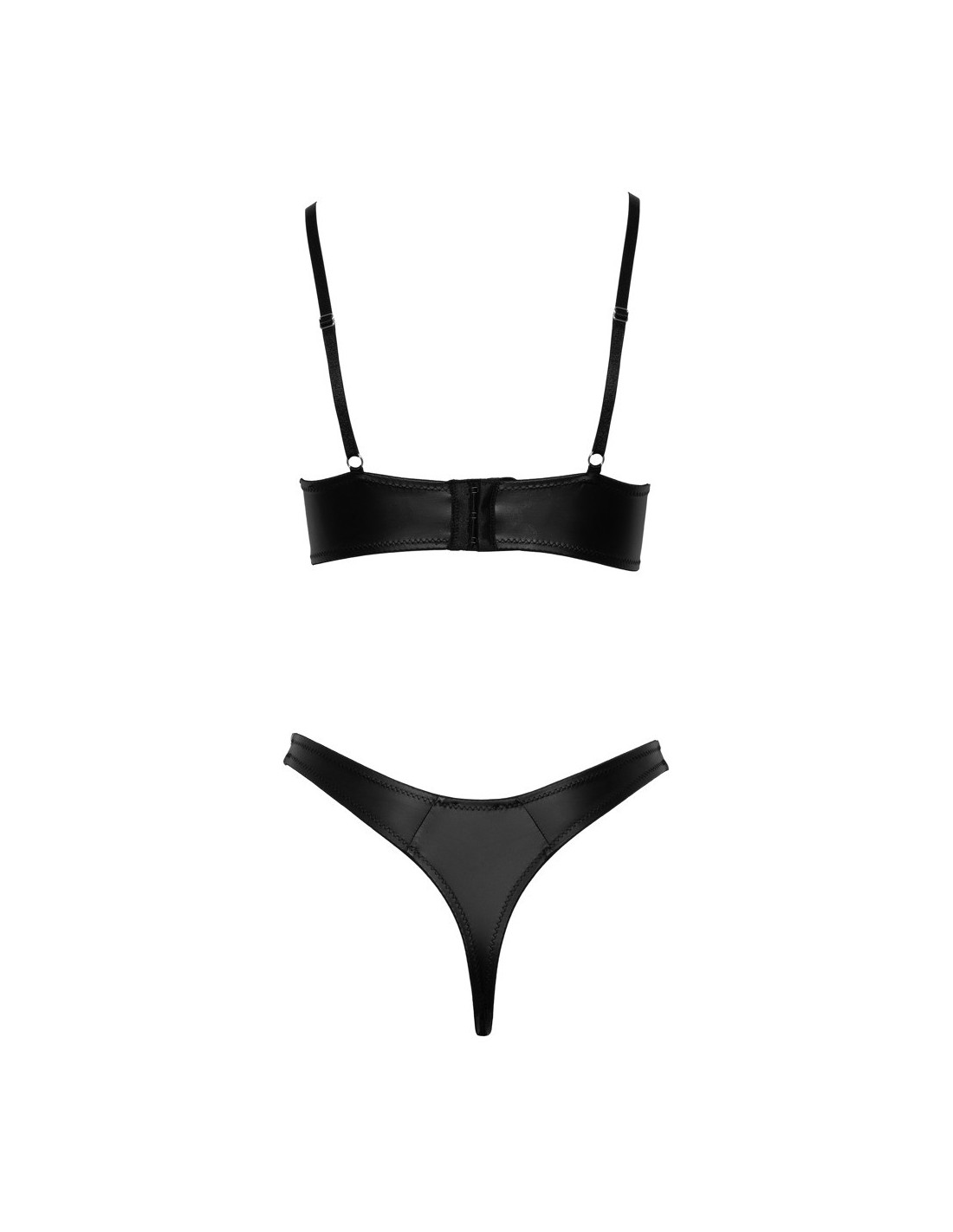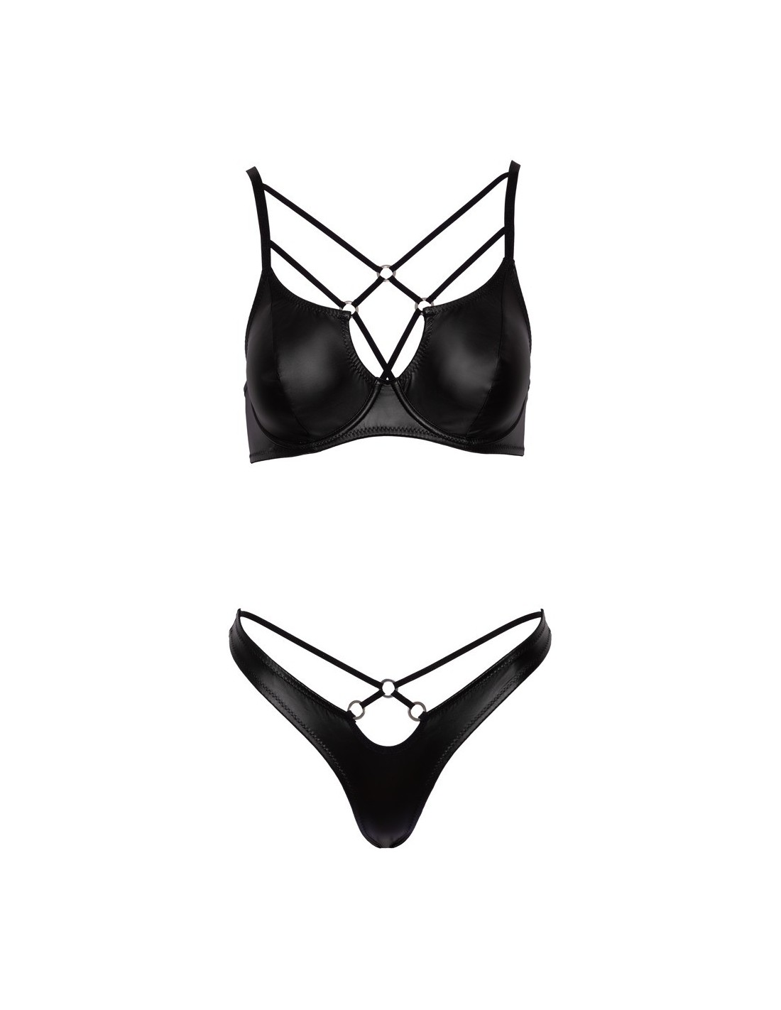 Ten komplet bielizny posiada usztywniane miseczki i elastyczne paski ozdobione srebrnymi pierścieniami, które dodają mu niepowtarzalnego uroku. Wygodne regulowane ramiączka i zapięcie na plecach sprawiają, że biustonosz idealnie dopasowuje się do Twojej sylwetki. Natomiast stringi z przodu ozdobione srebrnym pierścieniem na elastycznym pasie podkreślają piękno Twojej talii.