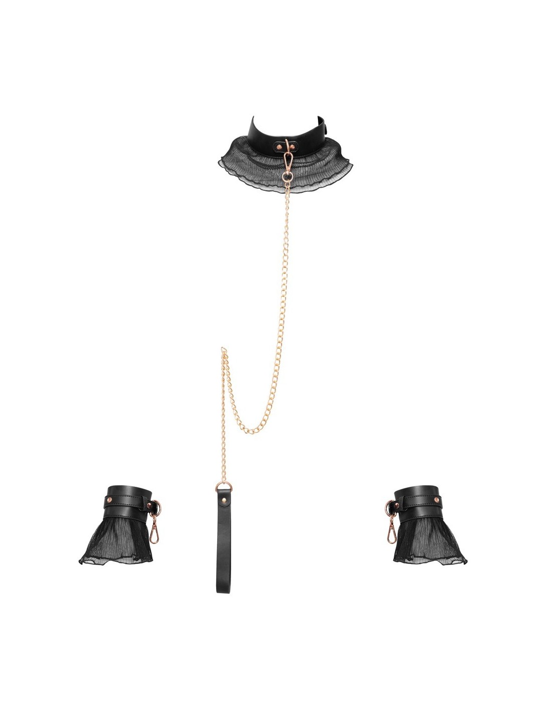 Designed for both beginners and experienced enthusiasts, the Bad Kitty Bondage Set Frill offers unparalleled comfort and adjustability. The collar with a removable chain leash allows you to take control or surrender to your partner's desires. The handcuffs, featuring rings and snap hooks, provide a secure and exciting restraint. Made from polyurethane and metal, with frills crafted from 100% polyester, this set ensures both durability and style.