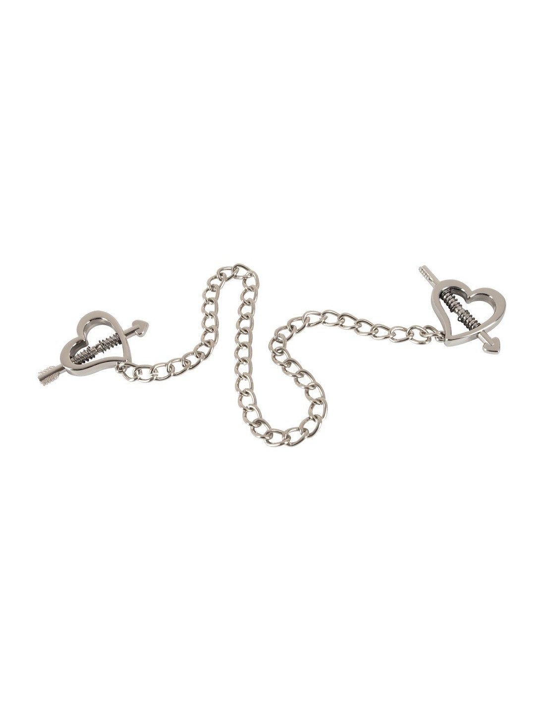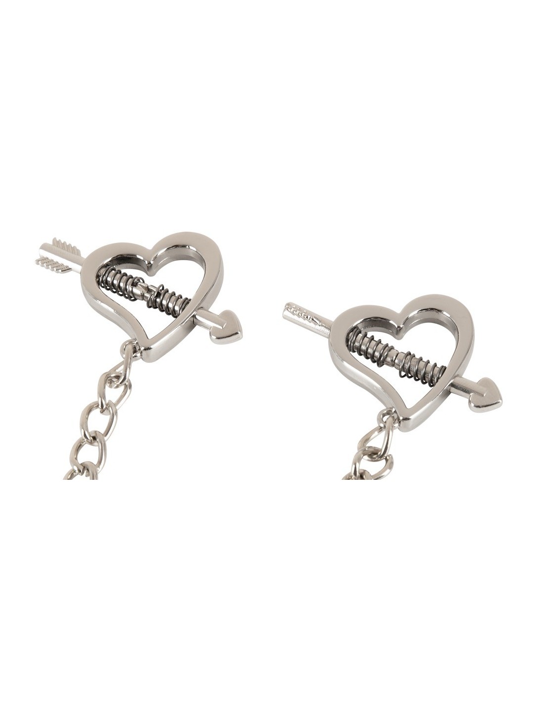 Featuring a stylish heart and two spring-loaded pins in an arrow design, these heart-shaped nipple clamps are a work of art. The pins can be easily pulled apart to place your nipple between them, creating a tantalizing grip that will make your senses come alive. Made from high-quality stainless steel, these clamps ensure durability and a comfortable fit, so you can focus on indulging in the pleasure they provide.