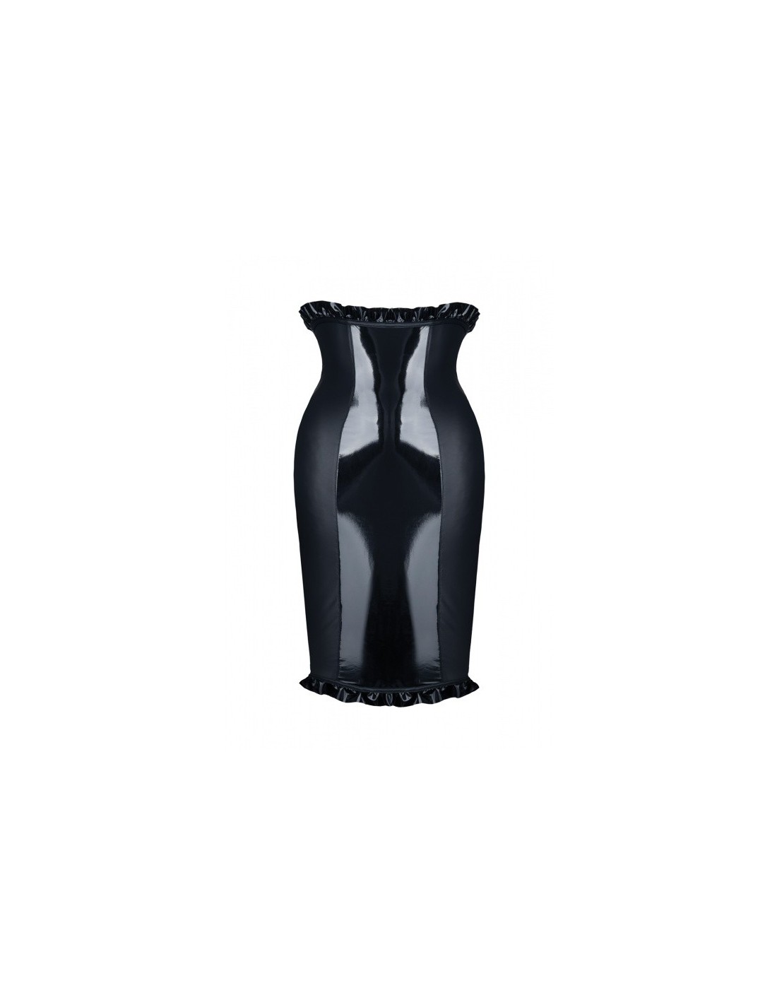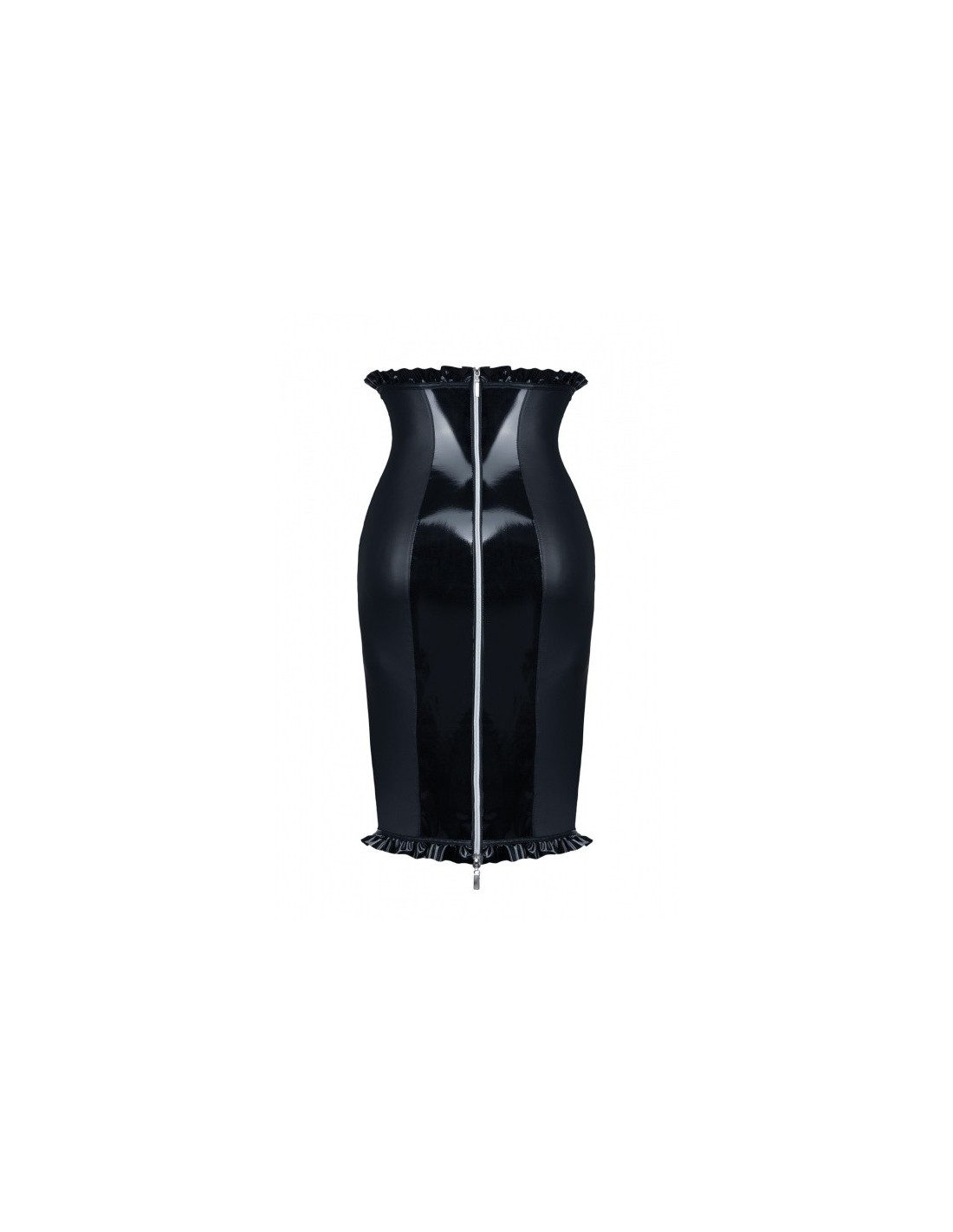 Nasza spódnica Anija Black S wyróżnia się nie tylko swoim dopasowaniem, ale także unikalnymi detalami. Duże pionowe elementy z lakierowanego materiału, widoczne z przodu i z tyłu, nadają jej drapieżnego charakteru i efektownego wyglądu. Dodatkowo, ozdobiona czarną, lakierowaną tasiemką na całym obwodzie, przyciąga uwagę i dodaje elegancji.