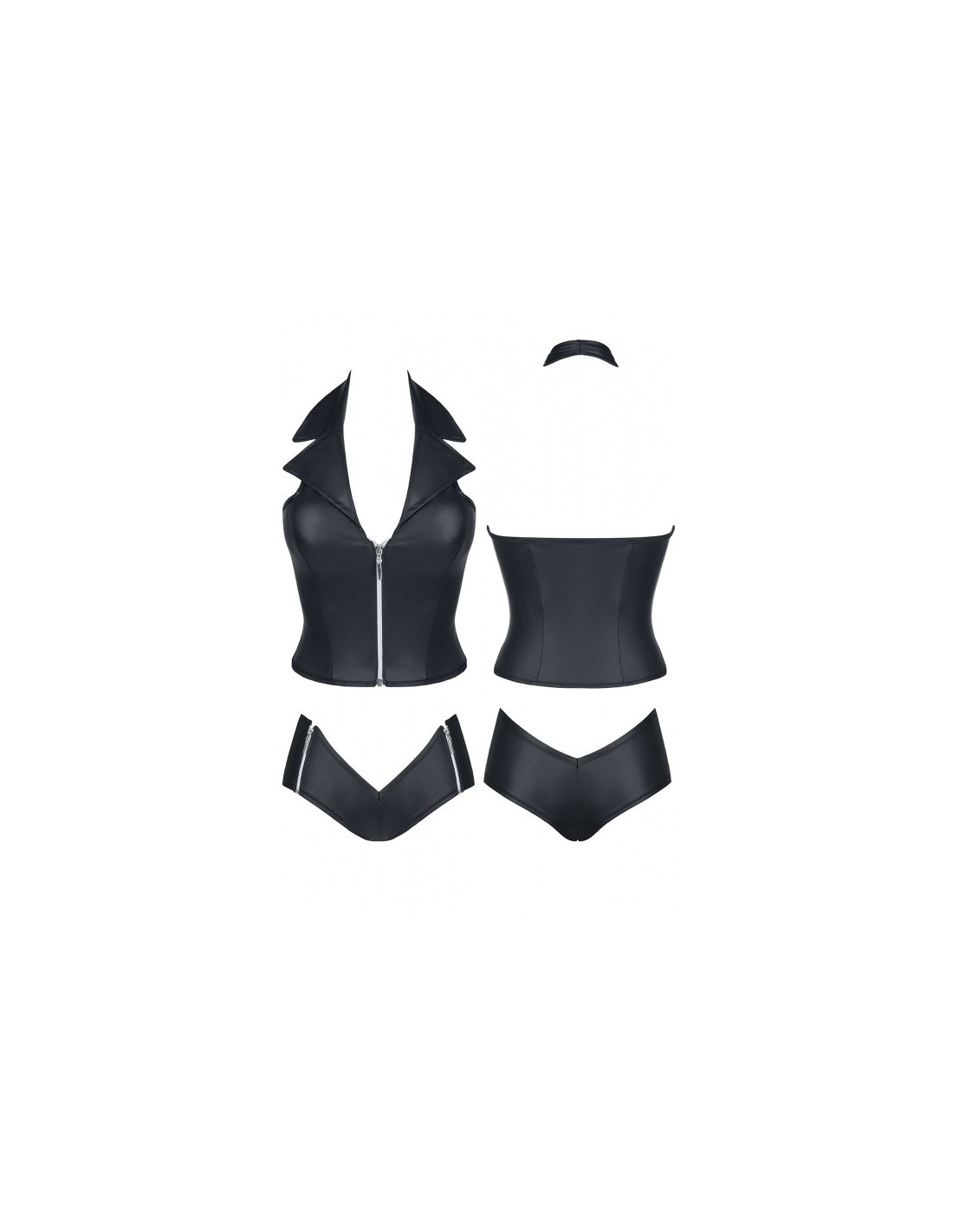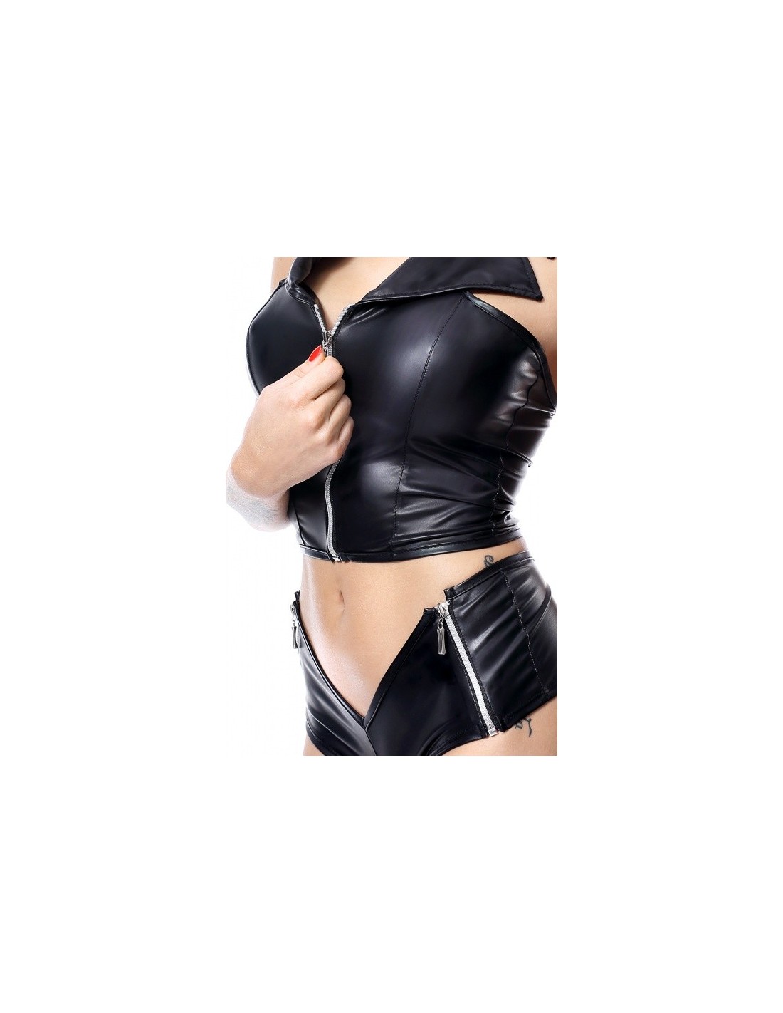 W komplecie:Kamizelka ze srebrnym ekspresem Szorty z dwoma ekspresami Obowiązkowa propozycja dla każdej pasjonatki bielizny i odzieży typu „clubwear”. Wysmakowany komplet obejmujący kamizelkę i szorty. W całości wykonany z elastycznej eko-skóry. Ciekawy, nowoczesny kształt, srebrne ekspresy, miłe w dotyku, elastyczne materiały, gwarantują seksowny i oryginalny wygląd. Z przodu szoty przykuwają uwagę pięknie wkomponowanymi ekspresami, które finezyjnie współgrają z wcięciem w kształcie odwróconego trójkąta.Elastyczne cechy materiału oraz specjalne profilowanie kształtu zarówno szortów jaki i kamizelki, wpływają na apetyczny i seksowny wygląd pośladków i piersi. Komplet Eva gwarantuje wiele satysfakcji oraz bardzo seksowny wygląd. Cechy charakterystyczne:1. Wzmacniające przeszycia w newralgicznych miejscach2. Metalowe elementy bez chromu i niklu3. Materiał elastyczny i sprężysty4. Materiał miły w dotyku5. Ekspresy odpinane z 1-nej strony Kolor bielizny: czarnyDostępne rozmiary bielizny: S,M,L,XL,XXLSkład bielizna: PVC: 100% polyester // ekoskóra: 95% polyester, 5% elastan