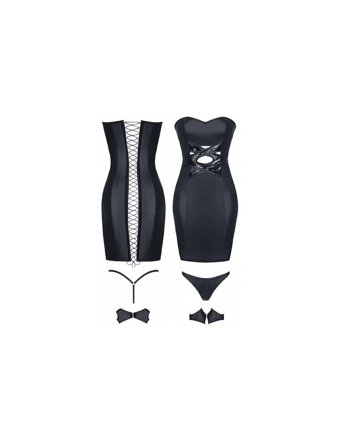 W komplecie z sukienką otrzymasz również niskostanowe stringi oraz krótkie rękawiczki na dłoń, wykonane z tego samego elastycznego materiału jak sukienka. Stringi podkreślą Twoje kształty, dodając Ci jeszcze więcej pewności siebie, a rękawiczki dodadzą Ci elegancji i tajemniczości.