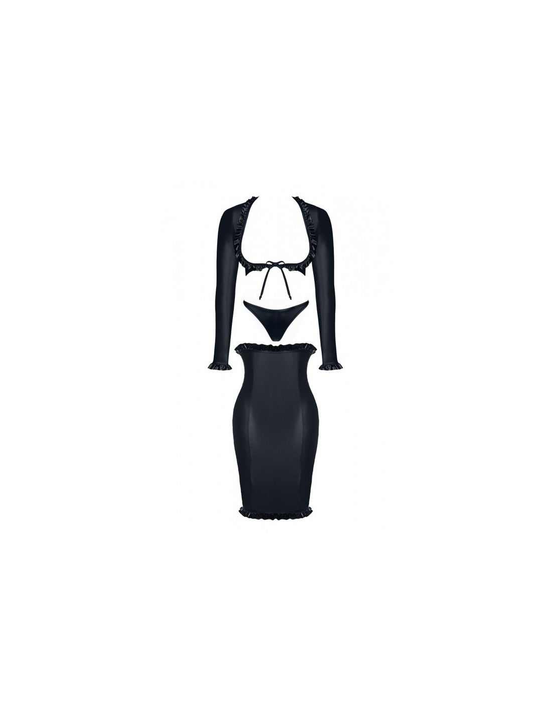 Ta niezwykle seksowna sukienka składa się z trzech elementów, które razem tworzą spektakularny efekt. Bluzka z długimi rękawami kusząco odsłania Twoje piersi, dodając nuty tajemniczości. Dekolt i rękawy ozdobione są czarną, lakierowaną tasiemką, która przyciąga wzrok i podkreśla Twoją kobiecość. Bluzka jest zawiązywana pod biustem, zapewniając wygodę i efektowny wygląd.