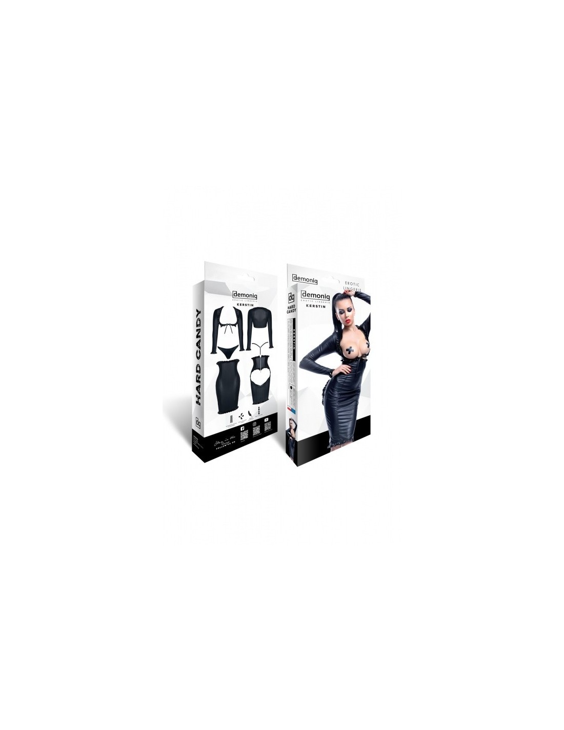 W komplecie:BluzkaSpódnicaStringi Ponętny komplet przygotowany z myślą o prowokowaniu i drapieżnych zabawach w nutą dominacji.Bluzka z długimi rękawami widowiskowo ukazuje nagie piersi. Na całym obwodzie dekoltu ozdobiona jest czarną, lakierowaną tasiemką, która znajduje się także na rękawach. Zawiązywana pod biustem. Wygodna i efektowna.Spódnica w całości wykonana z elastycznego materiału, dzięki czemu doskonale dopasowuje się do ciała i podkreśla jego linie. Specjalne profilowanie wyszczupla talię. Sięga od linii kolan, aż pod biust. Na całym obwodzie z dołu i góry ozdobiona czarną, lakierowaną tasiemką. Spektakularnie seksownie prezentuje się z tyłu, gdzie specjalnie wycięcie erotycznie ukazuje nagie pośladki. Wycięcie w kształcie serca podkreśla czarna lakierowana tasiemka. Jeszcze więcej pikanterii dodaje srebrny zamek. Jest odpinany z 2-u stron, co pobudza wyobraźnię i zdecydowanie podnosi temperaturę erotycznych zabaw. Seksowne stringi, będące w komplecie wyróżniają się niskim stanem. Ponętnie podkreślają nagie pośladki, widoczne w wycięciu spódnicy. Cały komplet wykonany jest z tych samych materiałów dzięki czemu stanowi spójną i atrakcyjną całość. Cechy charakterystyczne:1. Wzmacniające przeszycia w newralgicznych miejscach2. Metalowe elementy bez chromu i niklu3. Materiał elastyczny i sprężysty4. Materiał miły w dotyku5. Ekspres odpinany z 2-u stron Kolor: czarnyDostępne rozmiary: S,M,L,XL,XXLSkład surowca: PVC: 100% poliester // ekoskóra: 95% poliester, 5% elastan